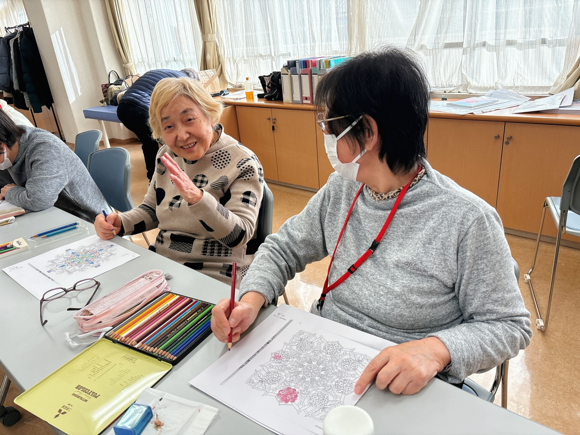 それぞれが自前の色鉛筆やカラーペンを持ち寄り、思い思いのペースで塗り絵を進めていきます。色を選ぶ時間もまた楽しく、あちこちから「この色きれいね」「どんなふうに塗ろうかしら」といった声が聞こえてきて、自然と会話も弾みます♪