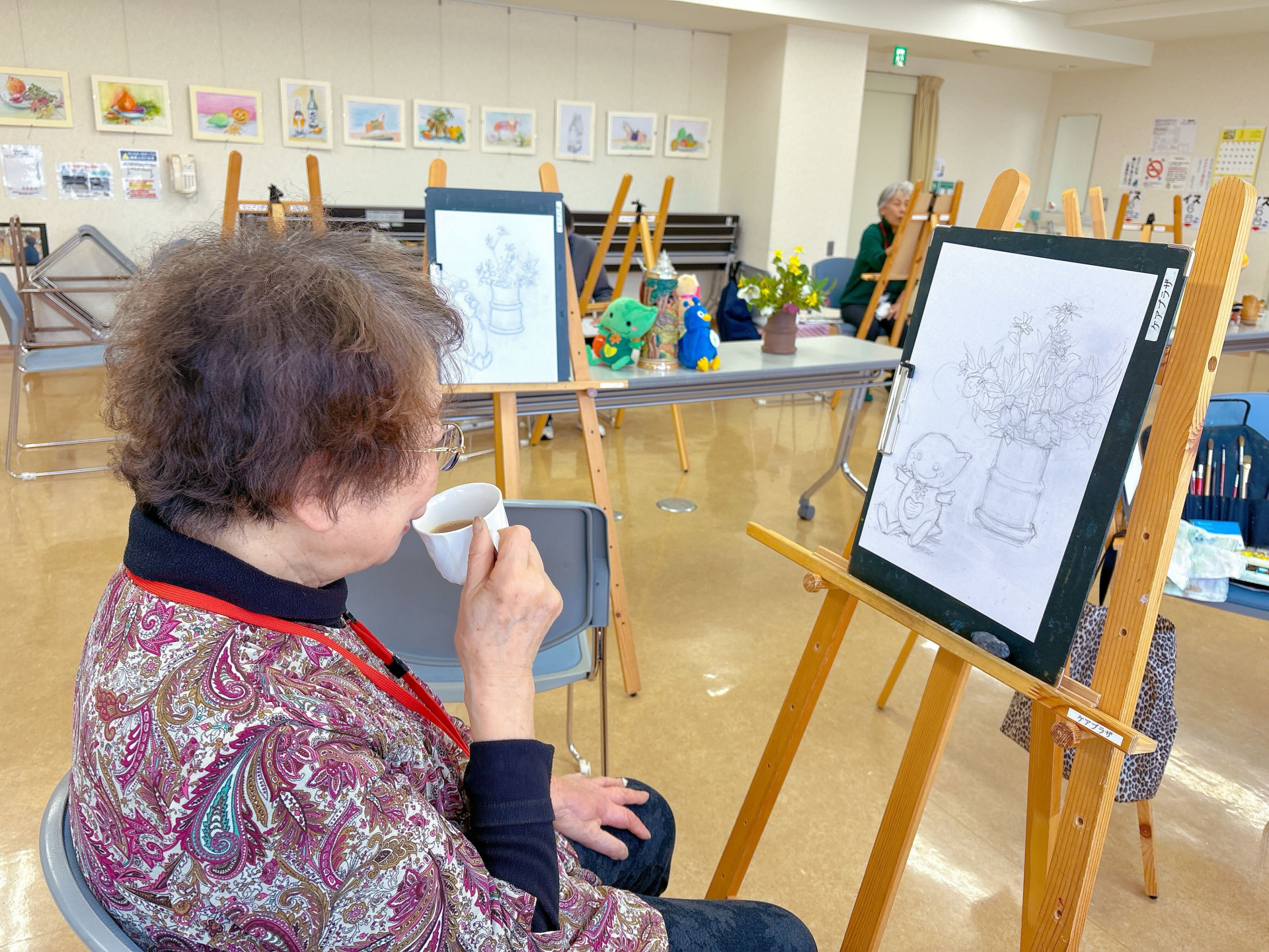 スケッチに集中しているときは気づかなかった部分も、コーヒーを飲みながら作品を客観的に眺めると「ここがちょっと小さかったわね」と新たな発見があったりします。 こうした“ほっと一息”の時間も、作品づくりには大切なプロセスですね。