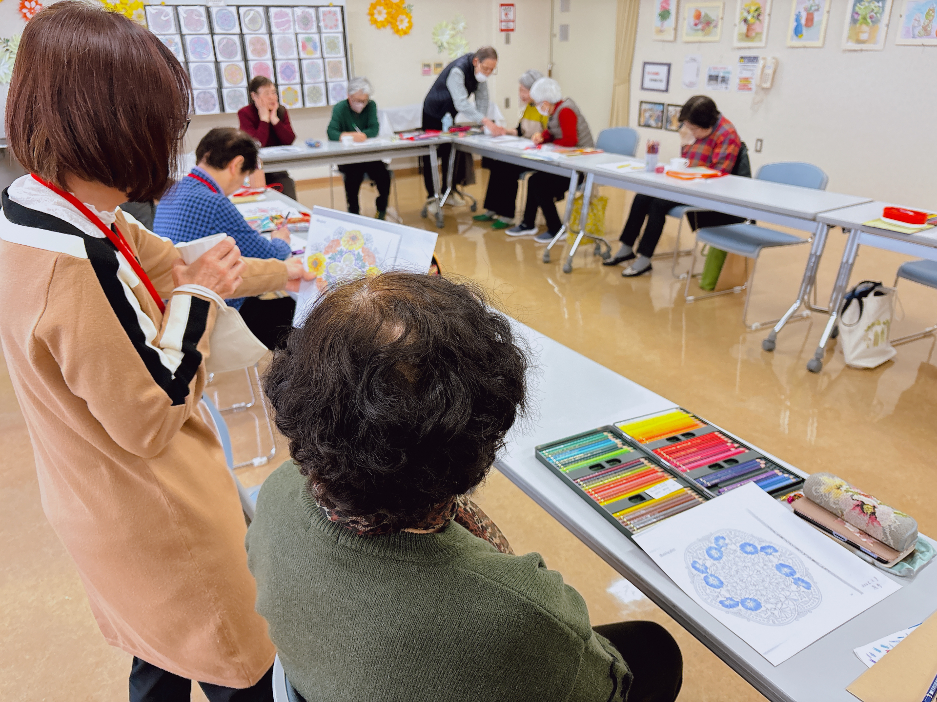 毎月第4木曜日に開催している「ぬりえアート」。デッサン講師・井上先生のご指導のもと、細かな模様が美しい曼荼羅塗り絵にじっくり取り組みました。