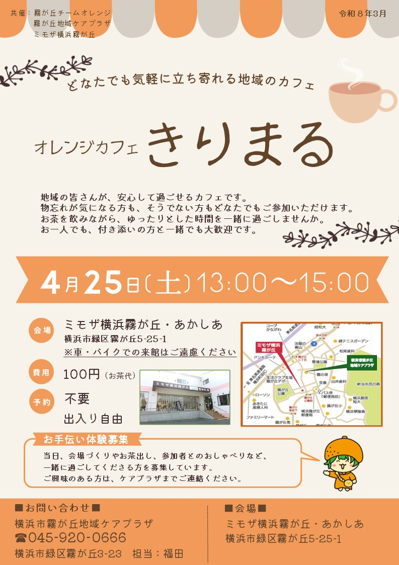 「オレンジカフェきりまる」は 4月25日(木)13:00~15:00 ミモザ横浜霧が丘・あかしあ にて開催します♪