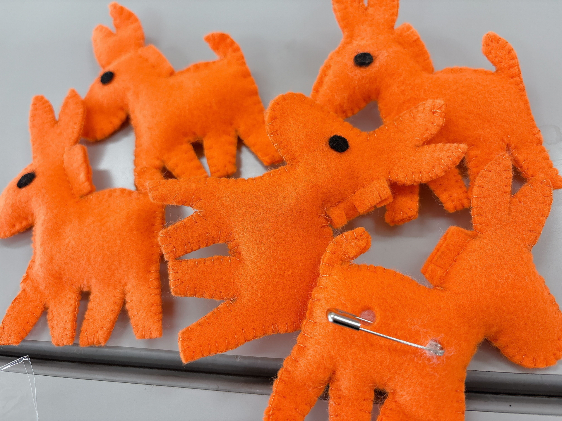 依頼内容はというと… 「洗えるように、つけ外しができて、目立つようにお願いします!」 という、かなりアバウトなお願いにも関わらず、クラフトメンバーの皆さんは笑顔で「面白そう!」とアイディアを次々に出してくださり、試作を重ねながら形にしていきました。