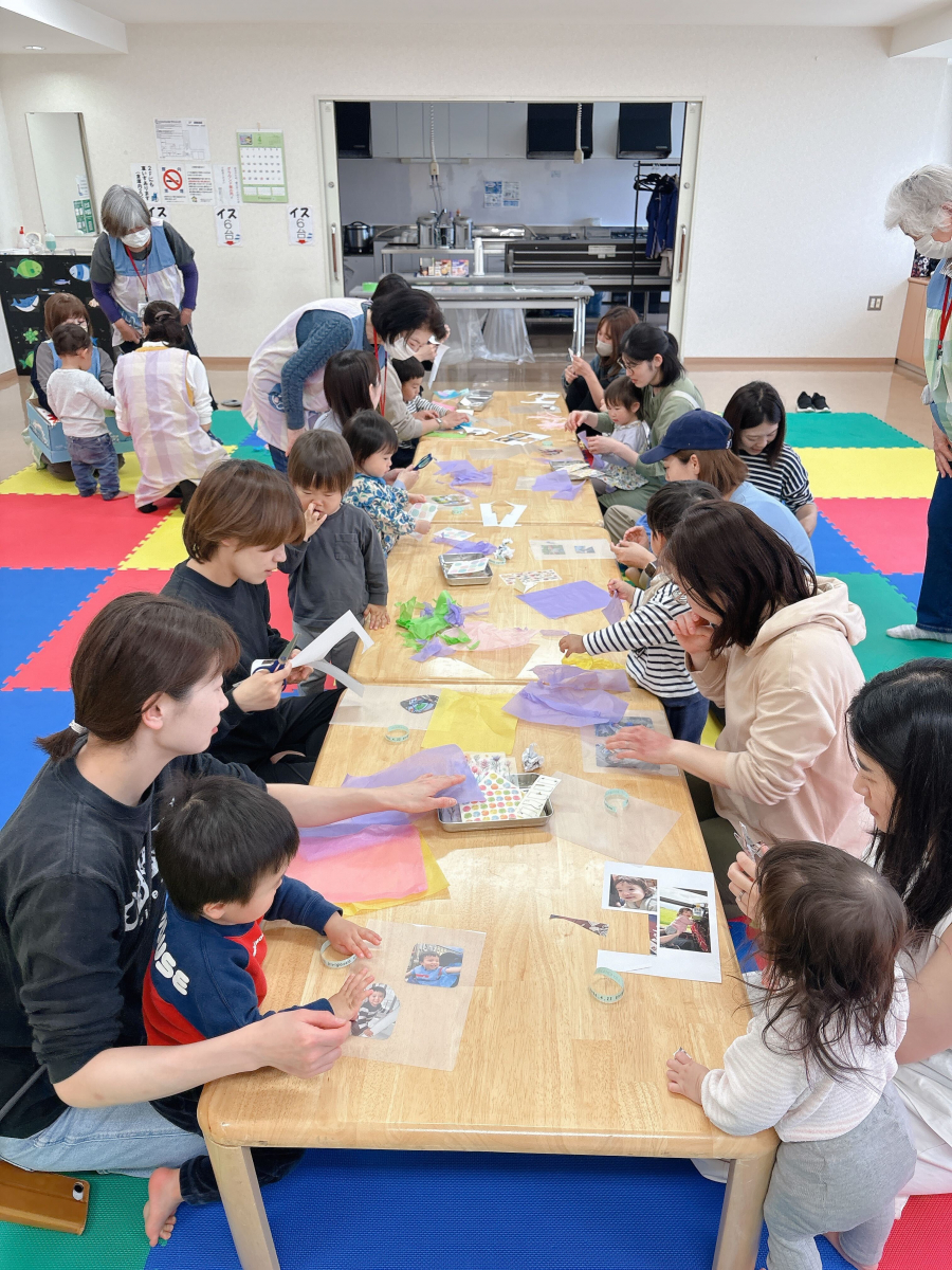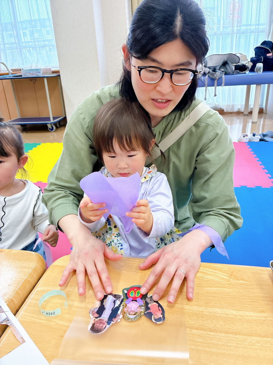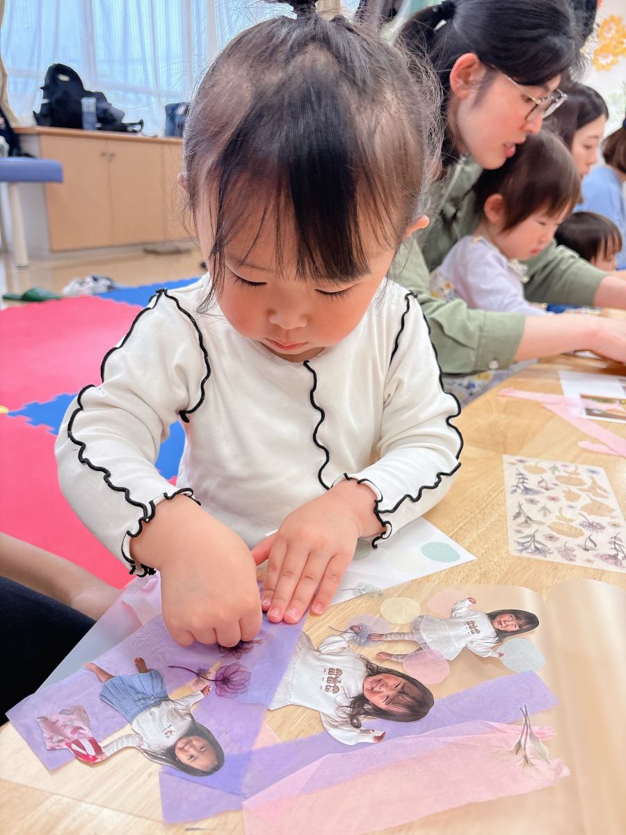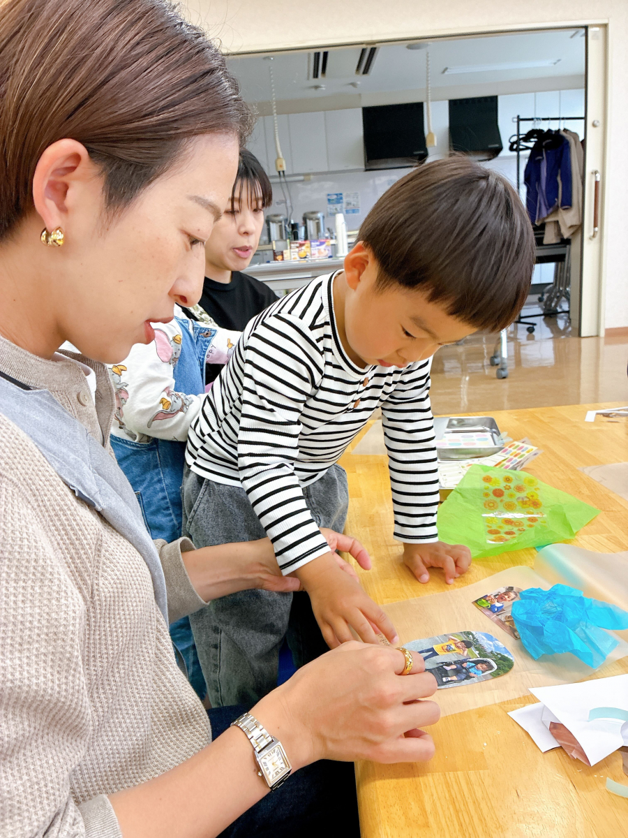 少しずつ慣れてきたところで、写真を使ったフォトプレートづくりに挑戦。 シールを夢中で貼る子、色紙をびりびり破って楽しむ子、ボランティアさんとにこにこ遊ぶ子… みんなそれぞれの“楽しい”を見つけて、のびのびと過ごしていました。