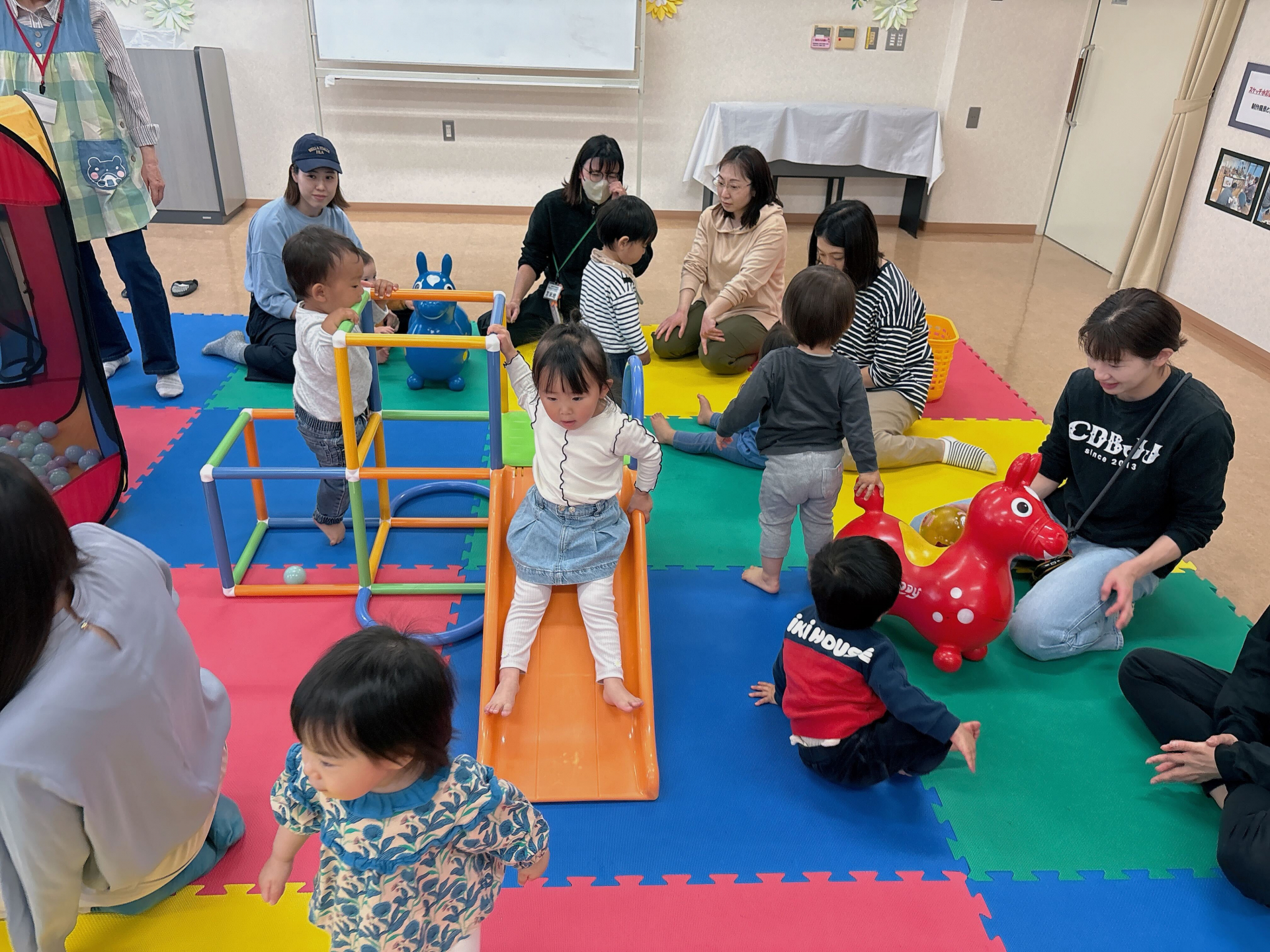 はじめは自由あそび♪ ボールプールやすべり台で思いきり遊びながら、子どもたちは少しずつ場に慣れていきます。 笑い声があちこちから聞こえてきて、会場は一気にあたたかい雰囲気に包まれました(*^-^*)