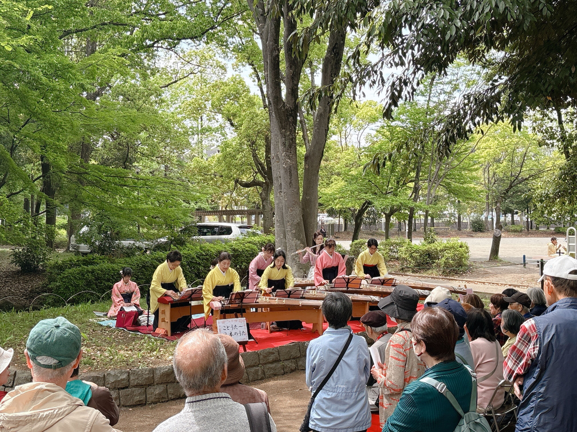 外の空気の中で聴くお琴は、屋内とはまた違った響きがあり、風に乗ってふわりと広がっていきます。近隣の方々も足を止め、しばし音色に聴き入っていました。春の空気と和楽器の調べが溶け合う、なんとも心地よい時間でした。