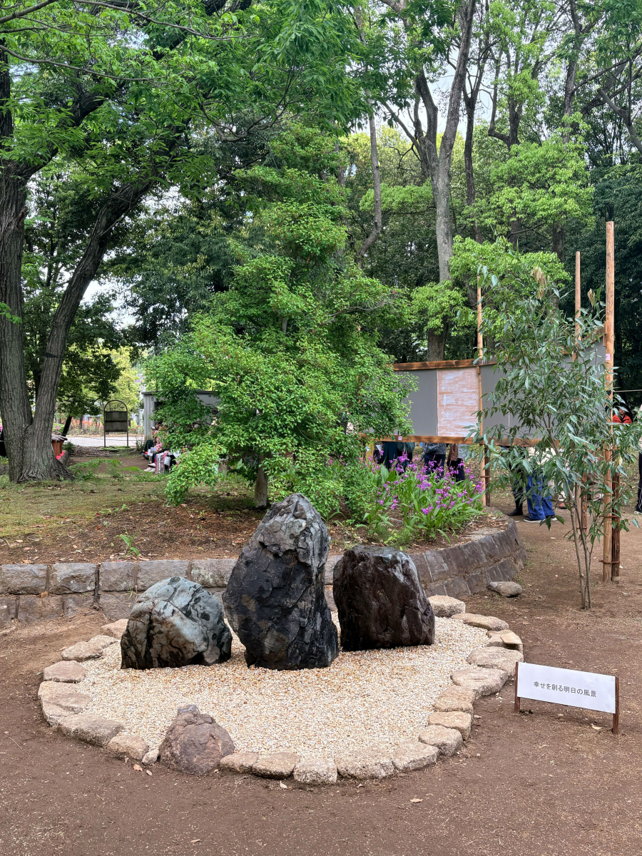 会場には、霧が丘緑舎のみなさんが手がけた創作庭が設えられ、訪れた人々を迎えてくれました。石組みとナナコ垣を組み合わせたその庭は、2027年国際園芸博覧会のテーマ「幸せを創る明日の風景」を表現したものだそうです。未来へ向けた庭づくりの一端を、地域でいち早く体験できる貴重な機会となりました。