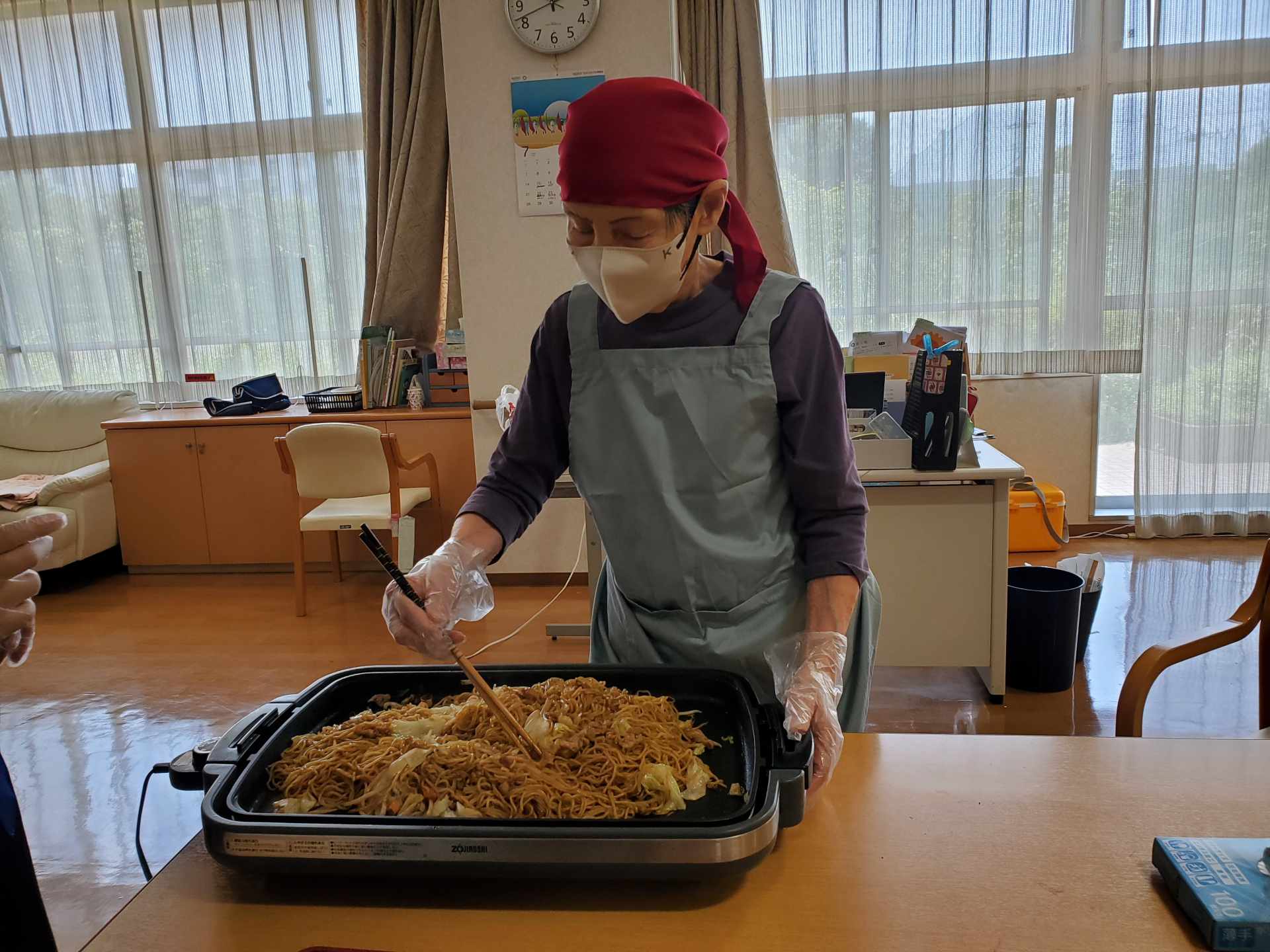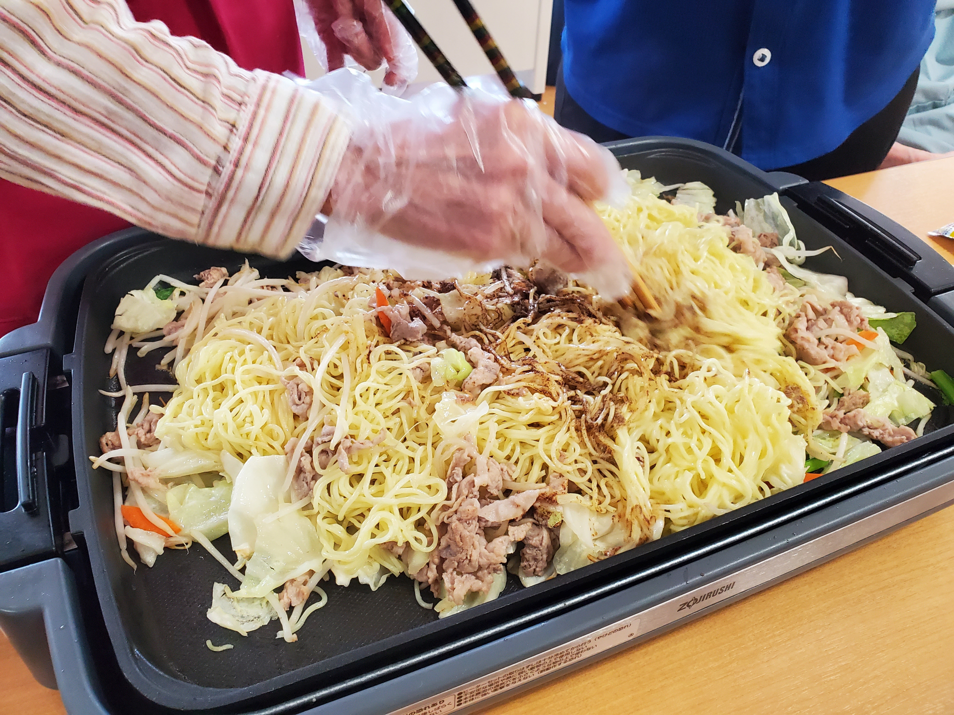 ホットプレートで豚肉、カット野菜、麺を焼きます。皆さまとっても手際よく炒めていました。職員は見守るだけ♡お任せです!
