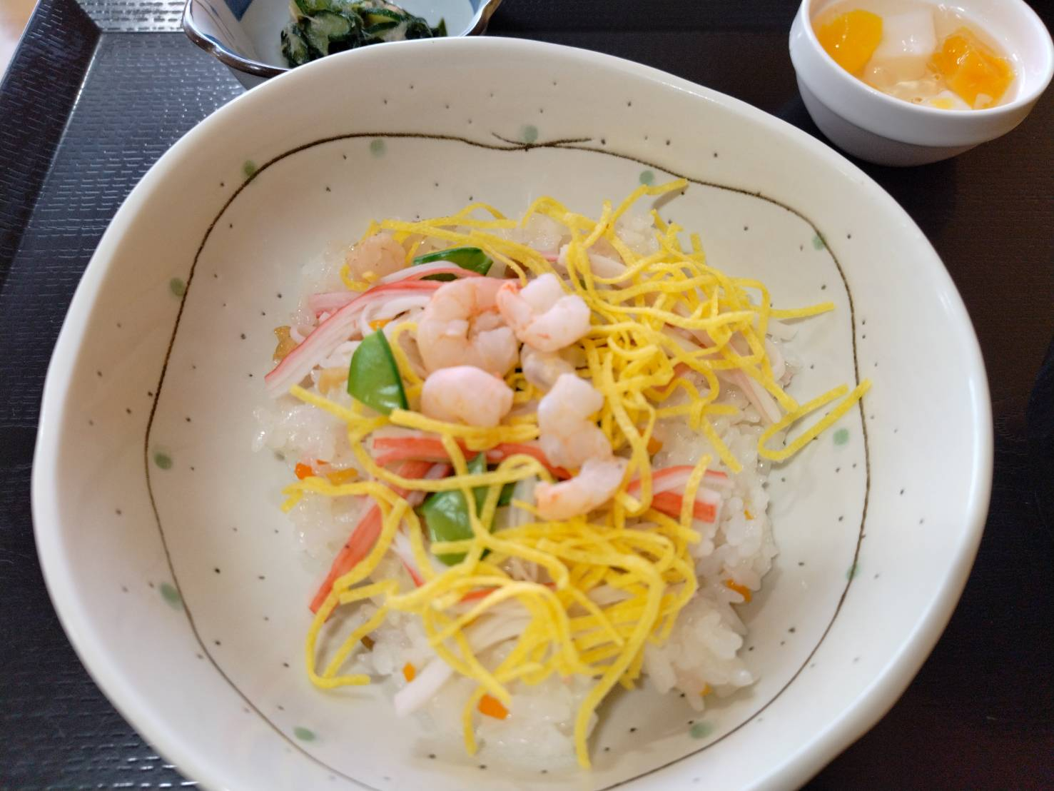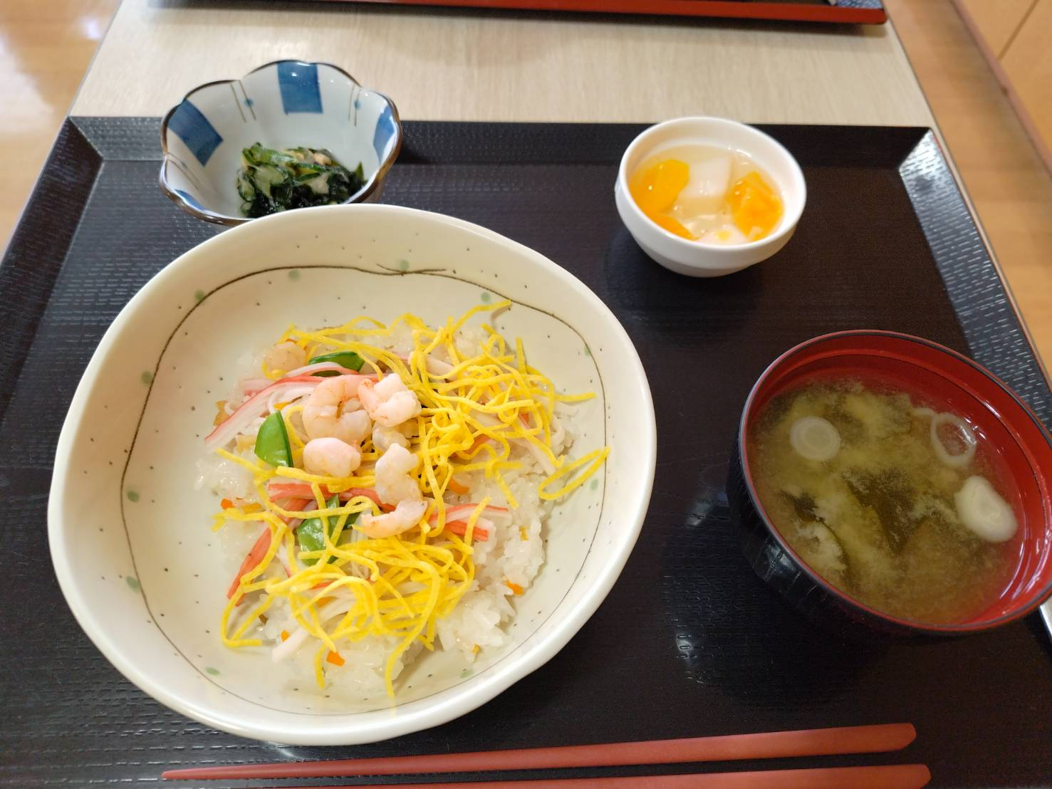 ・ちらし寿司 ・胡瓜とワカメの酢の物 ・杏仁豆腐 ・お味噌汁です。