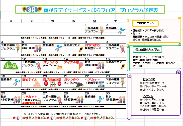 [霧が丘デイ]プログラム表☆8月号!(認知症対応型)
