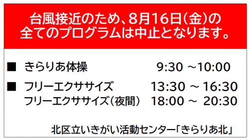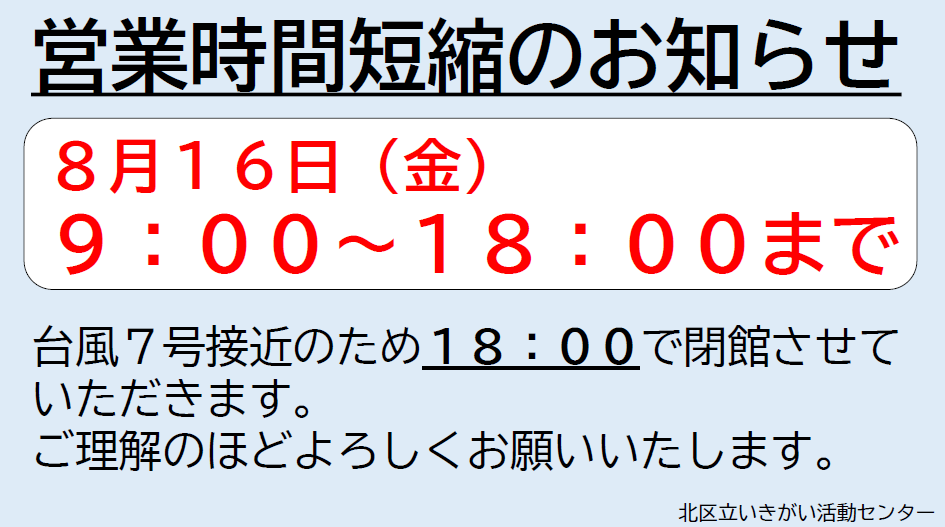 2024.08.15 お知らせ 【重要】台風接近に伴う営業時間短縮のお知らせ Tweet シェアする 明日の台風接近に伴い営業時間を短縮させていただきます。 恐れ入りますがご了承のほどよろしくお願いいたします。 前の記事 2024.08.25 お知らせ きらりあ通信9月号 次の記事 2024.08.15 お知らせ 【重要】台風7号の接近にともない明日8/16(金)の全てのプログラムは中止となります 一覧へ戻る