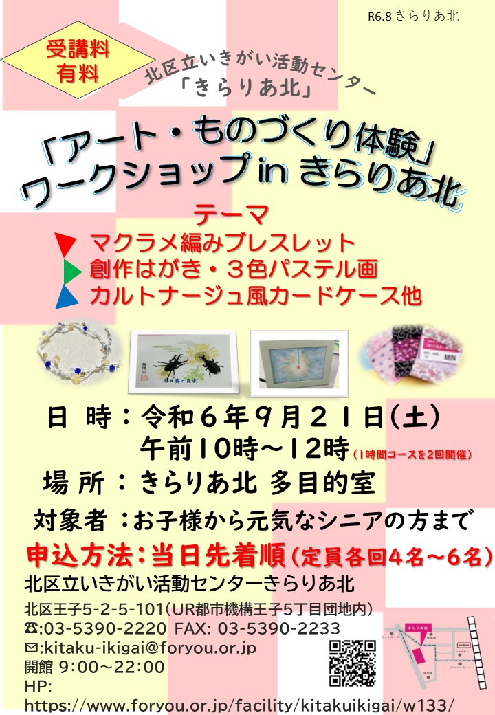 きらりあ北の利用者カードを入れるのに便利は「カード入れ」こちらは、カルトナージュと言って、紙を丁寧に貼り付ける作業をして、30分もあれば完成しますよ♪おひとり300円で体験できます。他にも素敵なブレスレットも作れます(1000円)創作はがきは(150円)、その他にも、初の試み「3色パステル画ワークショップ」「飛び出すカードづくり」「ミニチュアフードづくり」などなど新登場しますよ♬ ぜひぜひ、遊びにきてください♪