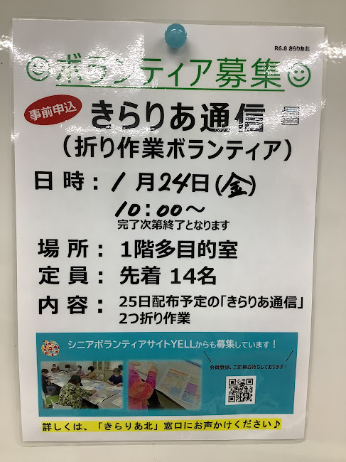 毎月25日にきらりあ北で発行している広報誌《きらりあ通信》を半分に2つ折りをする作業のお手伝いをお願いします‼