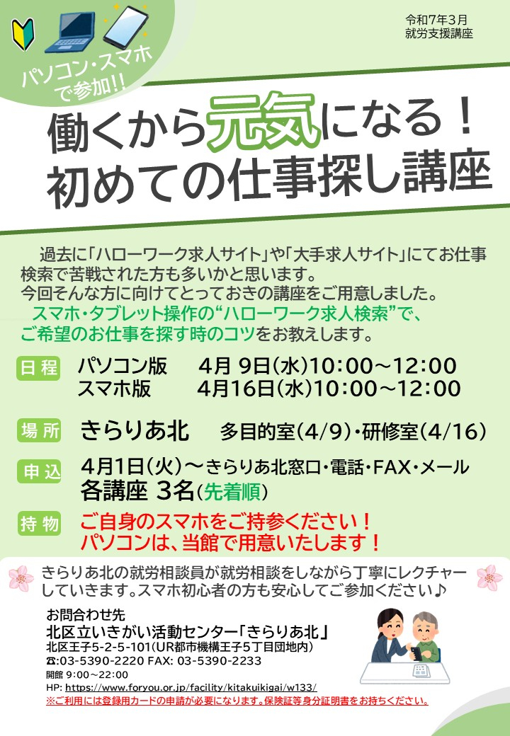 『働くから元気になる!初めての仕事探し講座』4月9日、16日に開催します!