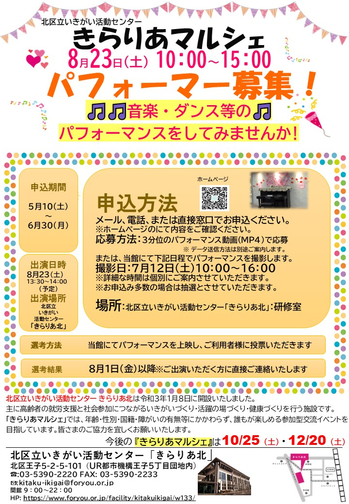 🎤パフォーマー募集!北区立いきがい活動センター「きらりあ北」マルシェイベント🎉