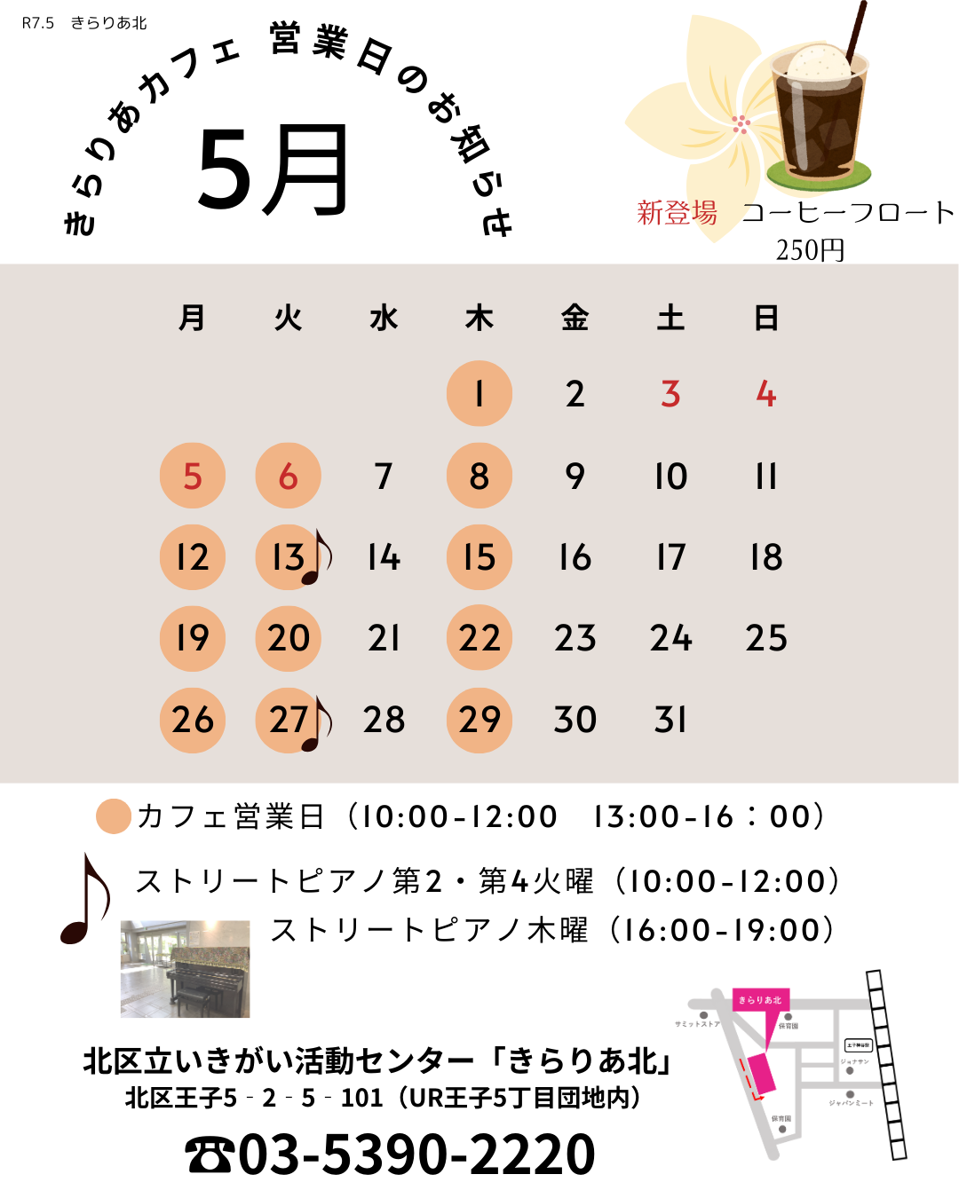 5月のきらりあカフェ営業日をお知らせいたします。
