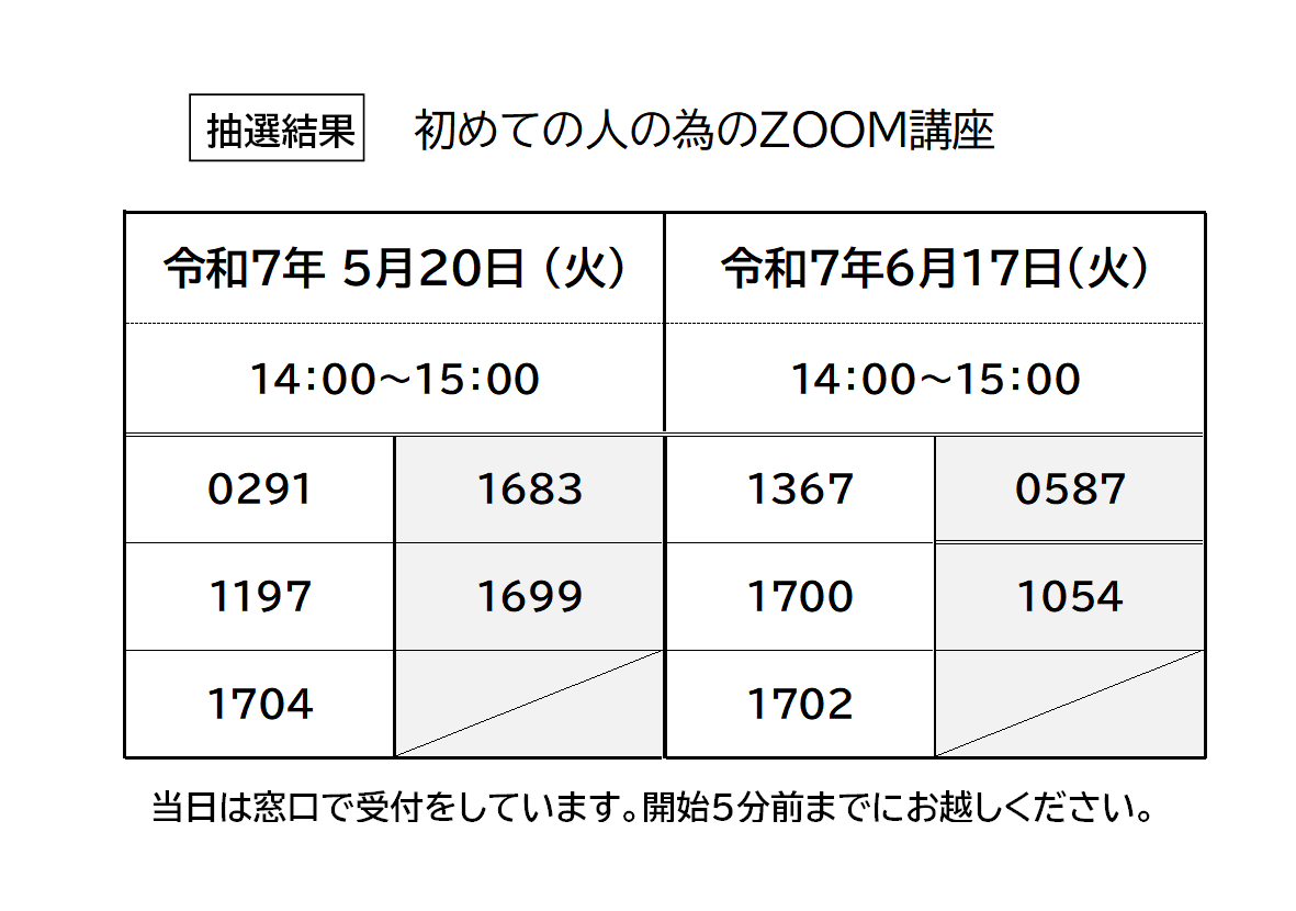5/20(火)・6/17(火)開催「初めての人のためのZoom講座」の抽選結果を発表させていただきます。