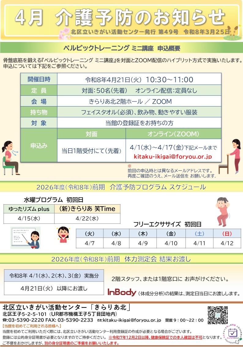 2026.03.25 お知らせ 【介護予防のお知らせ4月号】 Tweet シェアする 【介護予防のお知らせ】 介護予防のお知らせ4月号をご案内します。 前の記事 2026.03.25 お知らせ 【4/16(木)清掃のお仕事 個別相談会を開催します!】🧹 次の記事 2026.03.25 お知らせ スマホふらっと相談はじまります! 一覧へ戻る