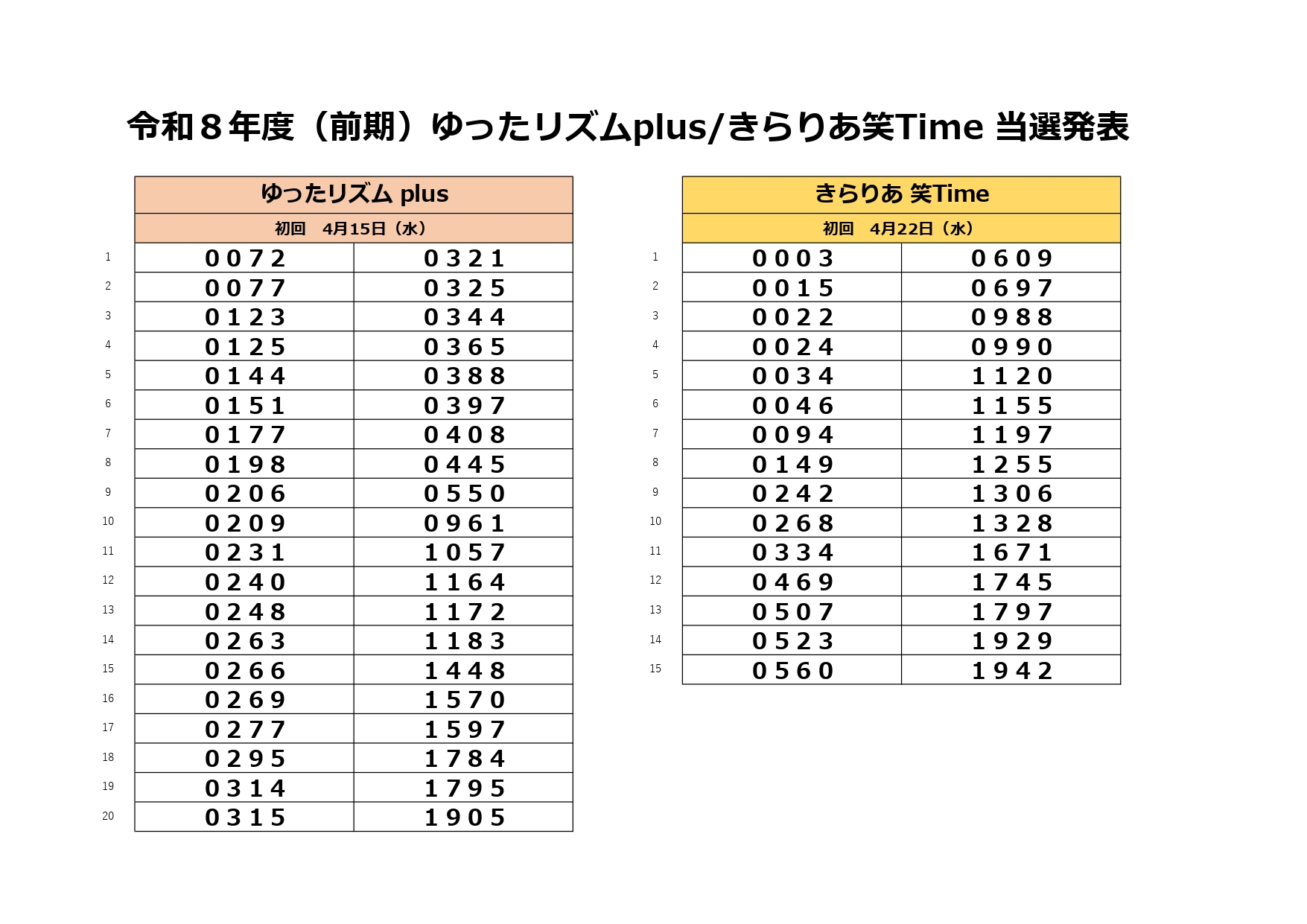 令和8年度 前期ゆったリズムplus/きらりあ笑Time 当選発表