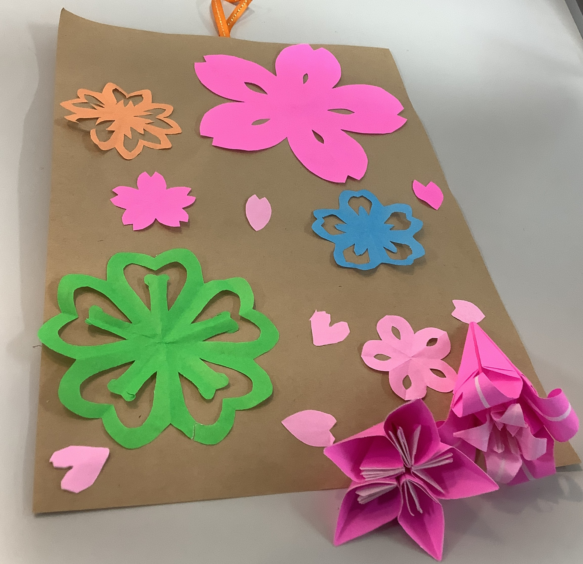 5角になるように紙を折って、桜を切りましたが、私先生にお願いして、百合や花も作りました。