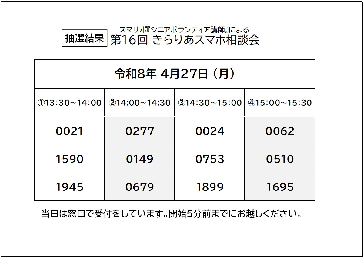 2026.04.13 お知らせ 第16回きらりあスマホ相談会【4/27(月)】抽選結果 Tweet シェアする 第16回きらりあスマホ相談会【4/27(月)】抽選結果 4/27(月)開催のスマホ相談会の当選発表させていただきます。 お申込みされた方は、ご確認をお願いいたします。 就労支援 N.U 一覧へ戻る
