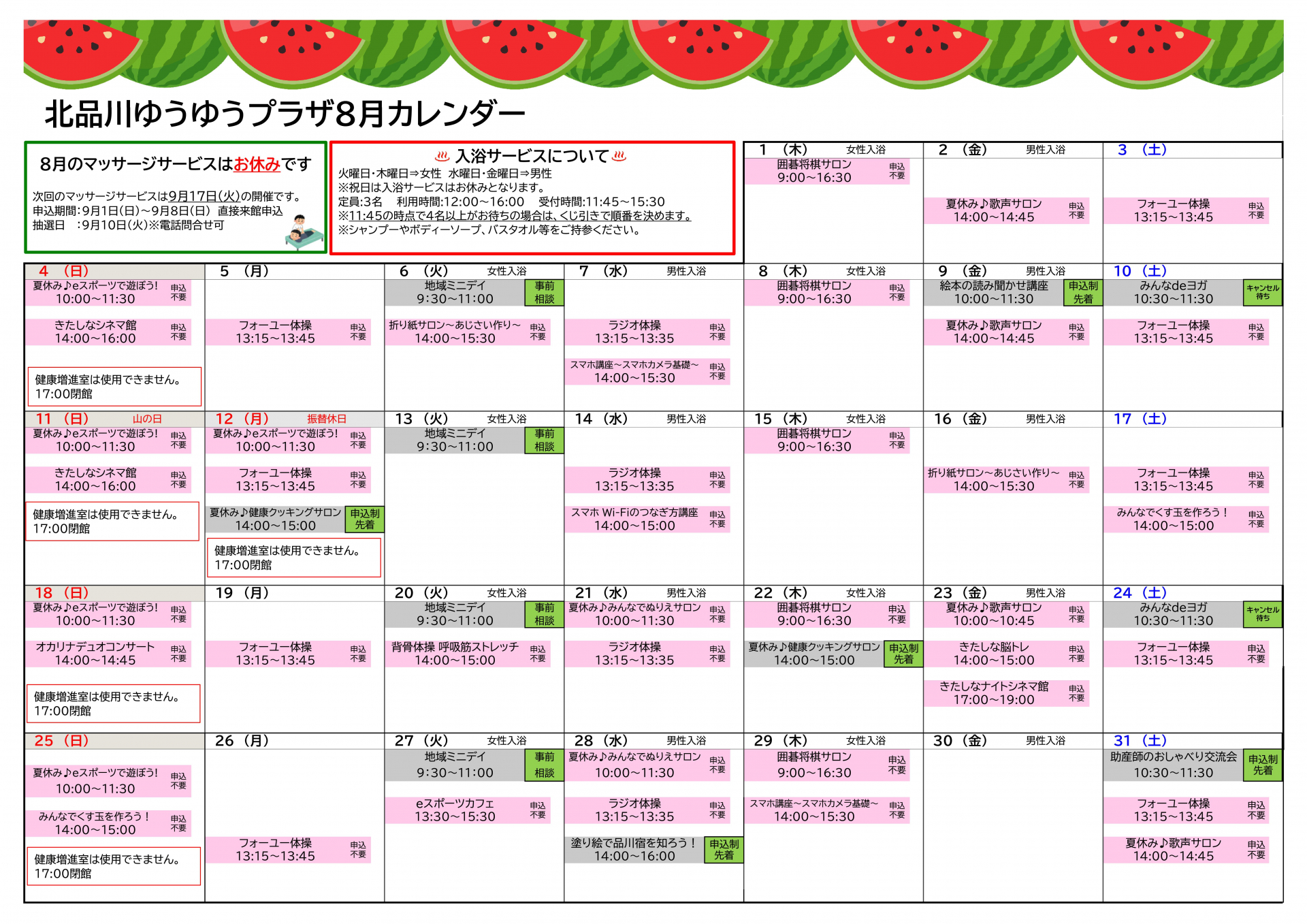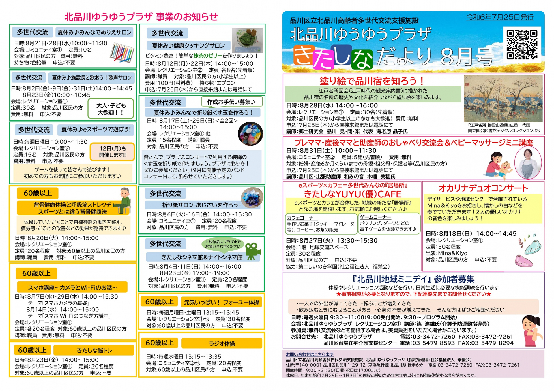 2024.07.25 お知らせ きたしなだより8月号を発行しました Tweet シェアする きたしなだより8月号を発行しました! PDF版はこちらからご確認ください。 #おたより #きたしなだより #広報誌 前の記事 2024.07.25 お知らせ 椅子を使って簡単にできる筋トレ&ストレッチ開催しました! 次の記事 2024.07.23 お知らせ ★職員の絵を描いていただきました★ 一覧へ戻る