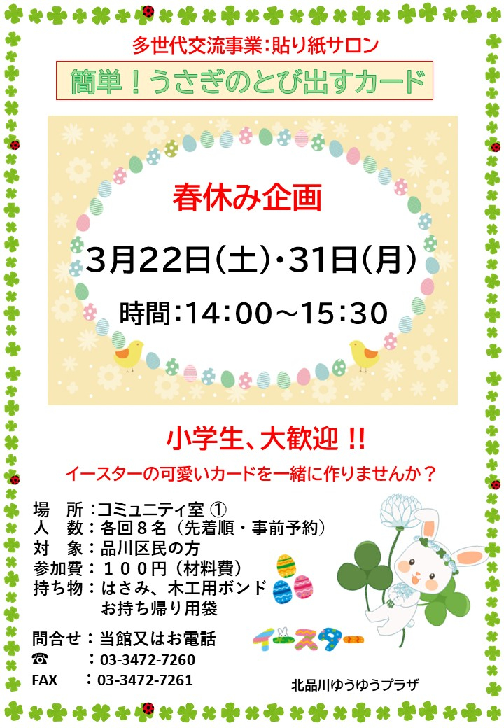 3月【貼り紙サロン】は、~うさぎのとび出すカード~を作ります♪