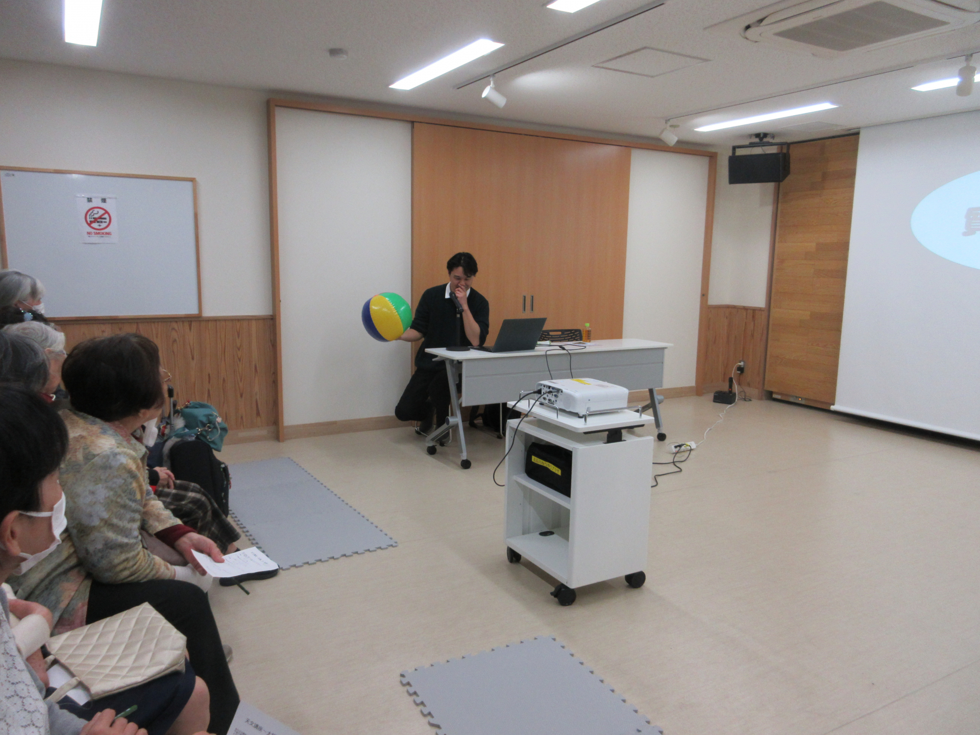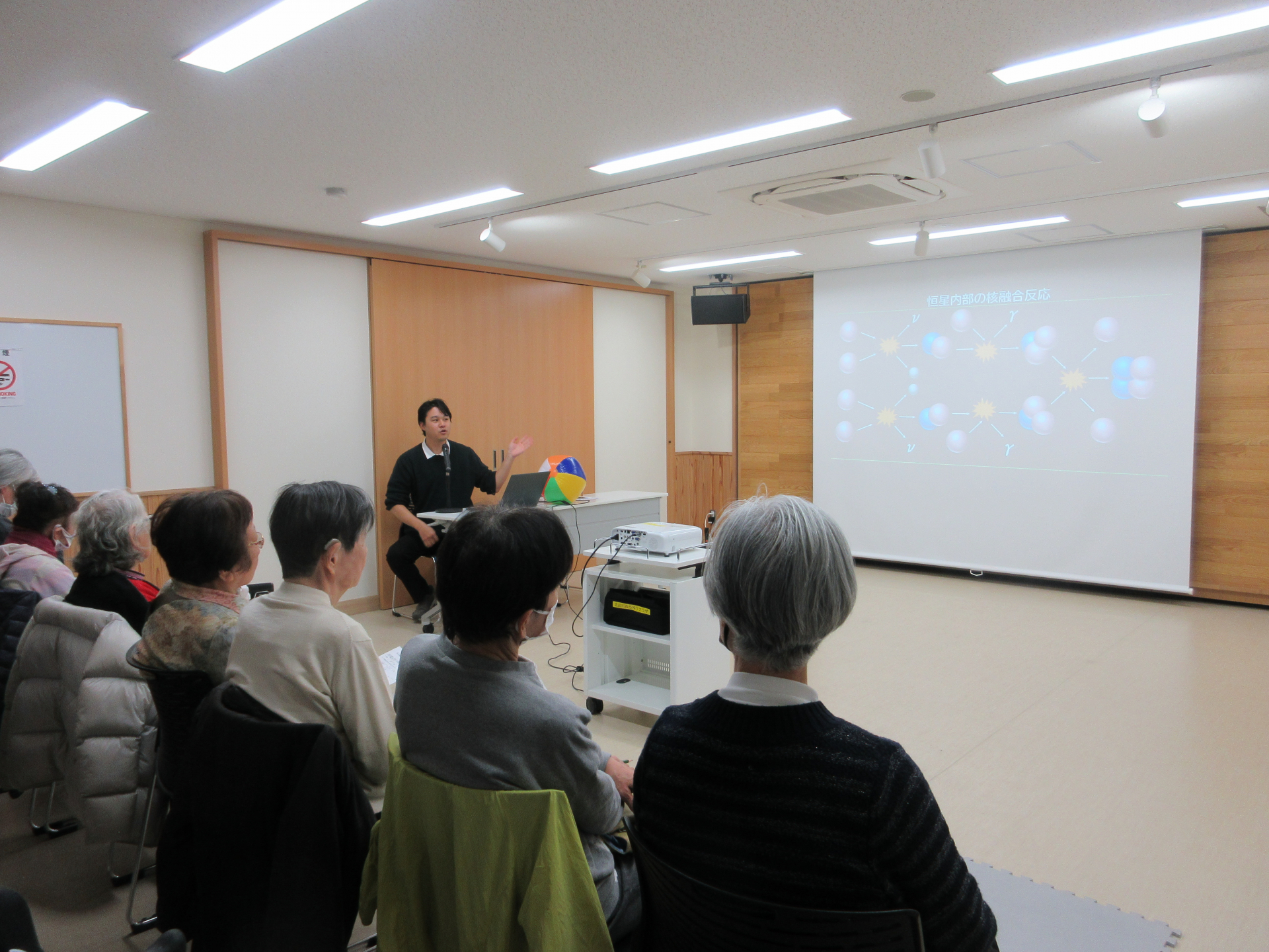 第3回目の講座はおおよそこのような感じで進みました。皆さん熱心に聞いていました。太陽の体積は地球の約130万倍です。米谷先生はビニールのボールとビーズの