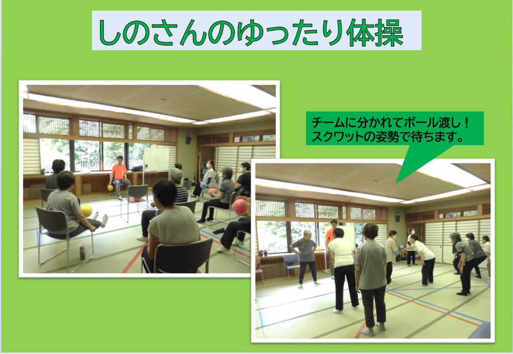 本日参加は16名。ストレッチで体をほぐした後は、4人ずつのチームに分かれて順番にボール渡し。待っている間は中腰です。これはなかなかキツイです!ゲーム感覚で体を鍛えられるが楽しいですね!