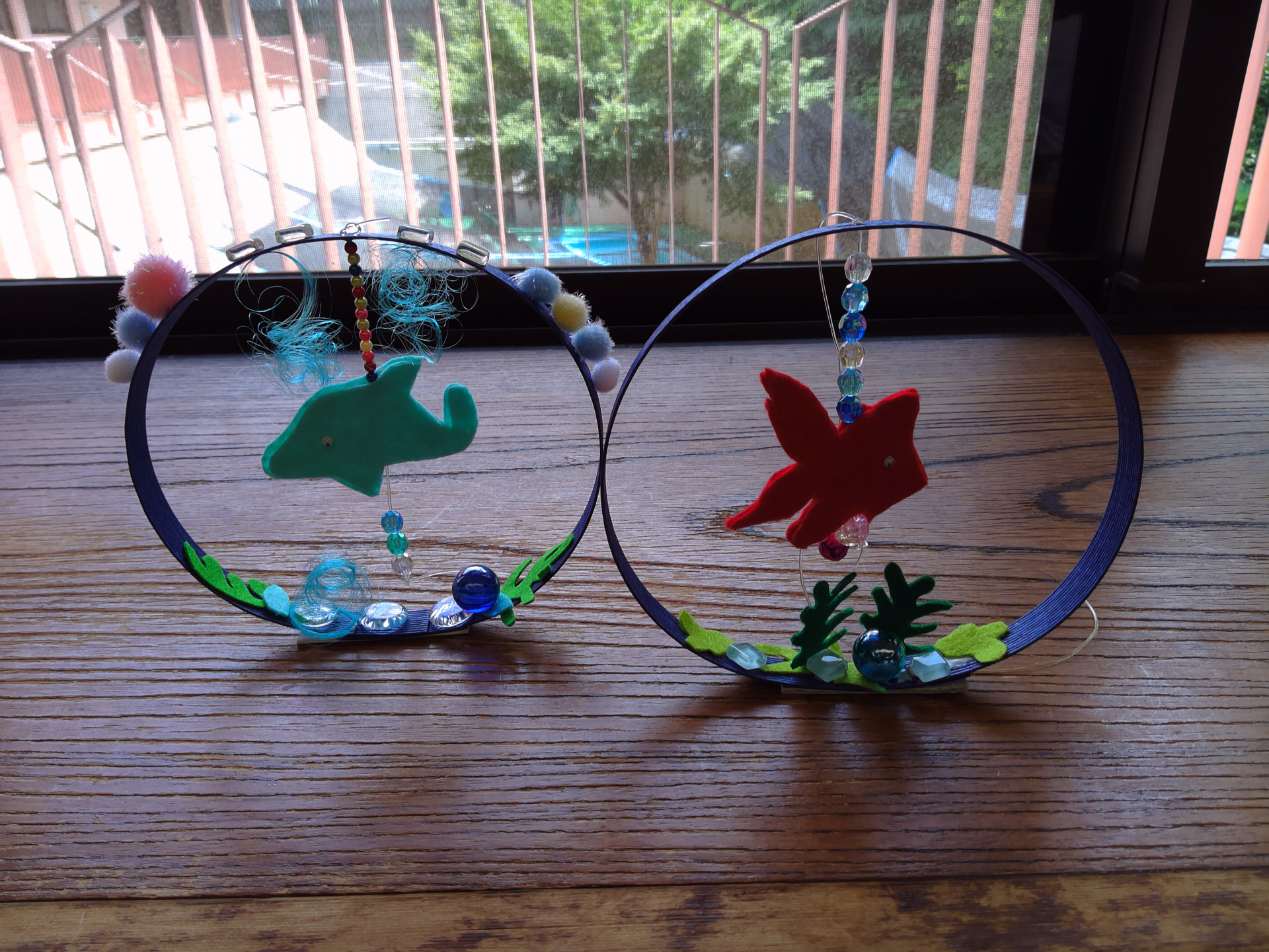 イルカや金魚をフェルトで作って、ビー玉やビーズで周りに好きな飾り付けをしていく作業…、