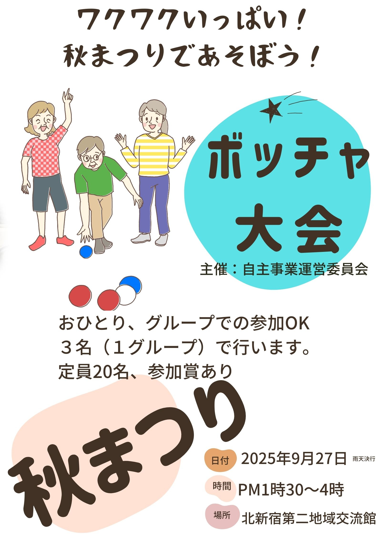 2025.08.28 お知らせ ボッチャ大会お知らせ Tweet シェアする 9月27日 自主事業運営委員会主催による秋まつりボッチャ大会を行います。 お申込みお待ちしております。 前の記事 2025.08.28 お知らせ 手芸 次の記事 2025.08.27 お知らせ ボッチャ 一覧へ戻る
