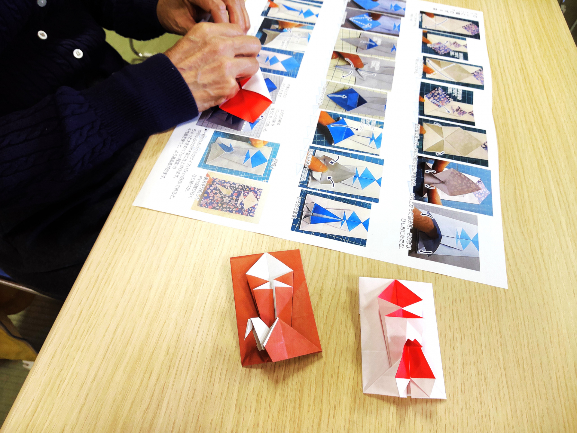 続いて挑戦したのは「鶴のポチ袋」。少し細かい折り方でしたが、皆さん真剣そのもの。羽を広げると、ふっくらとした鶴が現れ、「わぁ、できた!」と歓声が上がりました。折り目の美しさや色合わせによって、それぞれ個性あふれる仕上がりになりました。