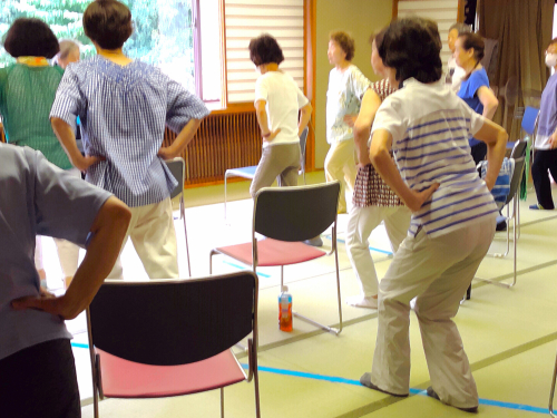 座ったままでも、立って大きく動いてもOK。年齢や体力に合わせられます。 -