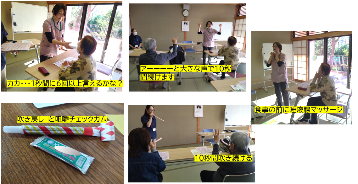 口腔機能のアップのための 「吹き戻し」訓練、食事前の唾液腺マッサージ、パタカラの1秒間の回数チェック