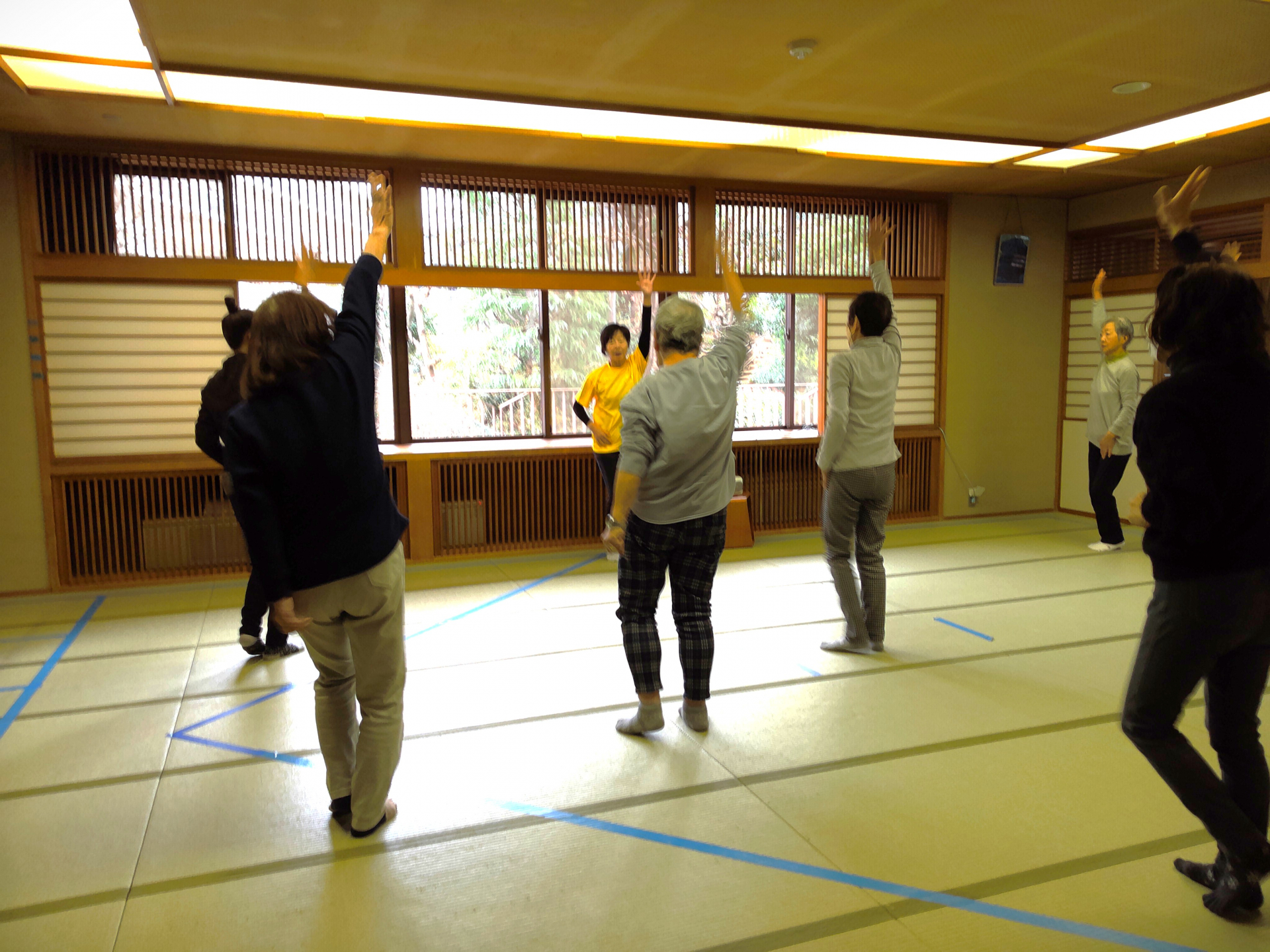 畳のお部屋の広間で行われるこの講座では、ストレッチをしっかりおこなった後のほぐしたカラダで音楽に合わせてウォーキングをするためより軽やかに動けます。