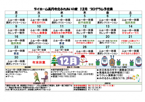 2025.12.01 【高円寺デイ】★12月のプログラム★ お知らせ #デイサービス #デイ #介護 #福祉 #奉優会 #デイホーム高円寺北ふれあいの家 #12月のプログラム 2024.12.02 【高円寺デイ】★12月のプログラム★ お知らせ #デイサービス #デイ #介護 #福祉 #奉優会 #デイホーム高円寺北ふれあいの家 #12月のプログラム