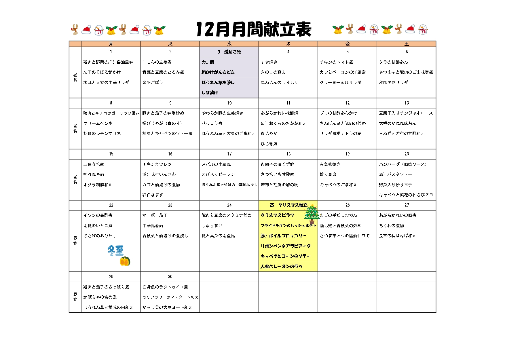 2025.12.01 お知らせ 【高円寺デイ】★12月の献立★ Tweet シェアする デイホーム高円寺北ふれあいの家☆今月も美味しいお食事を提供致します! \令和7年12月の献立表です/ #デイサービス #デイ #介護 #福祉 #奉優会 #デイホーム高円寺北ふれあいの家 #12月の献立 前の記事 2025.12.04 お知らせ 【高円寺北デイ】冬の訪れを感じる「絵手紙教室」 次の記事 2025.12.01 お知らせ 【高円寺デイ】★12月のプログラム★ 一覧へ戻る