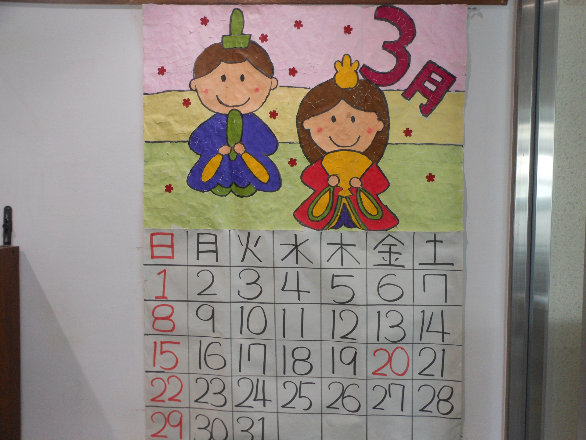 毎月玄関前に飾られている特大カレンダーですが、こちらは毎月、ご利用者様方の貼り絵による共同制作です。