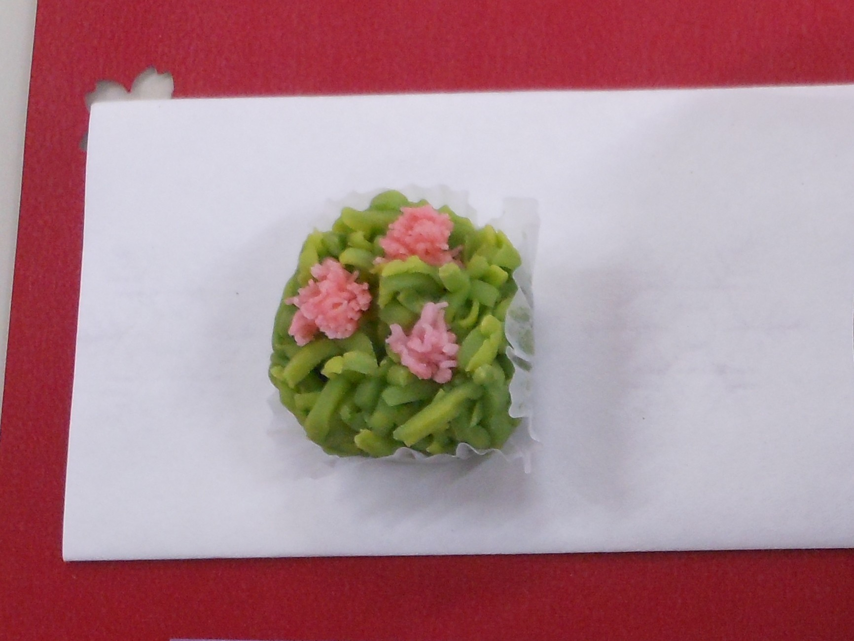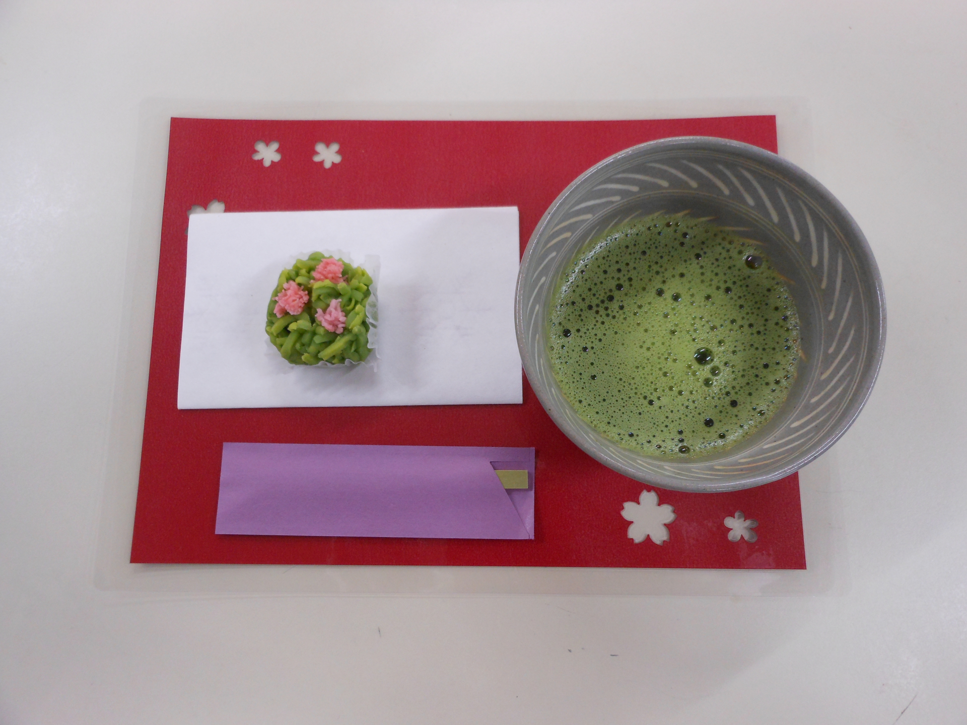 抹茶の色とおそろいでピンクがアクセントになっておりました。