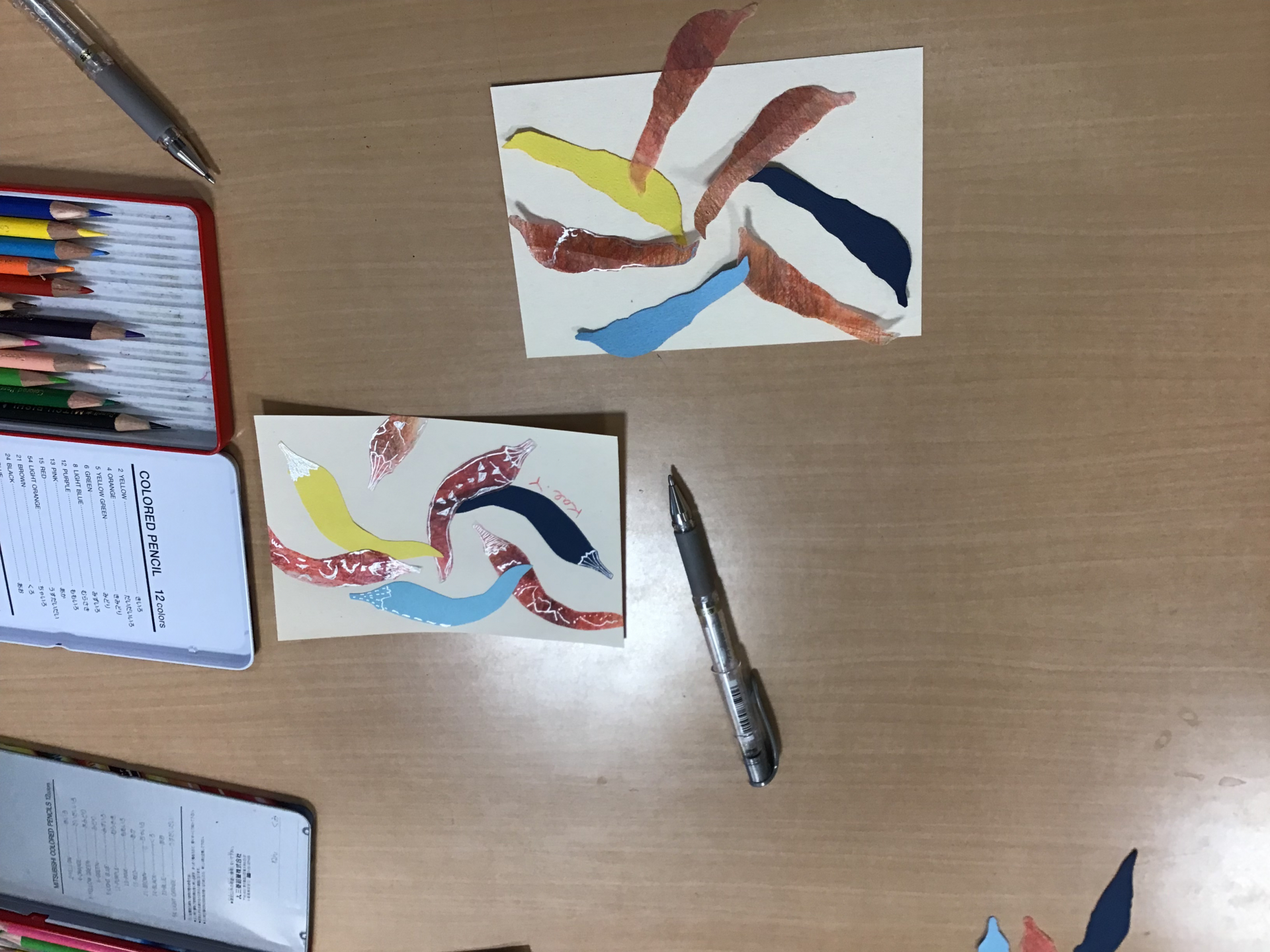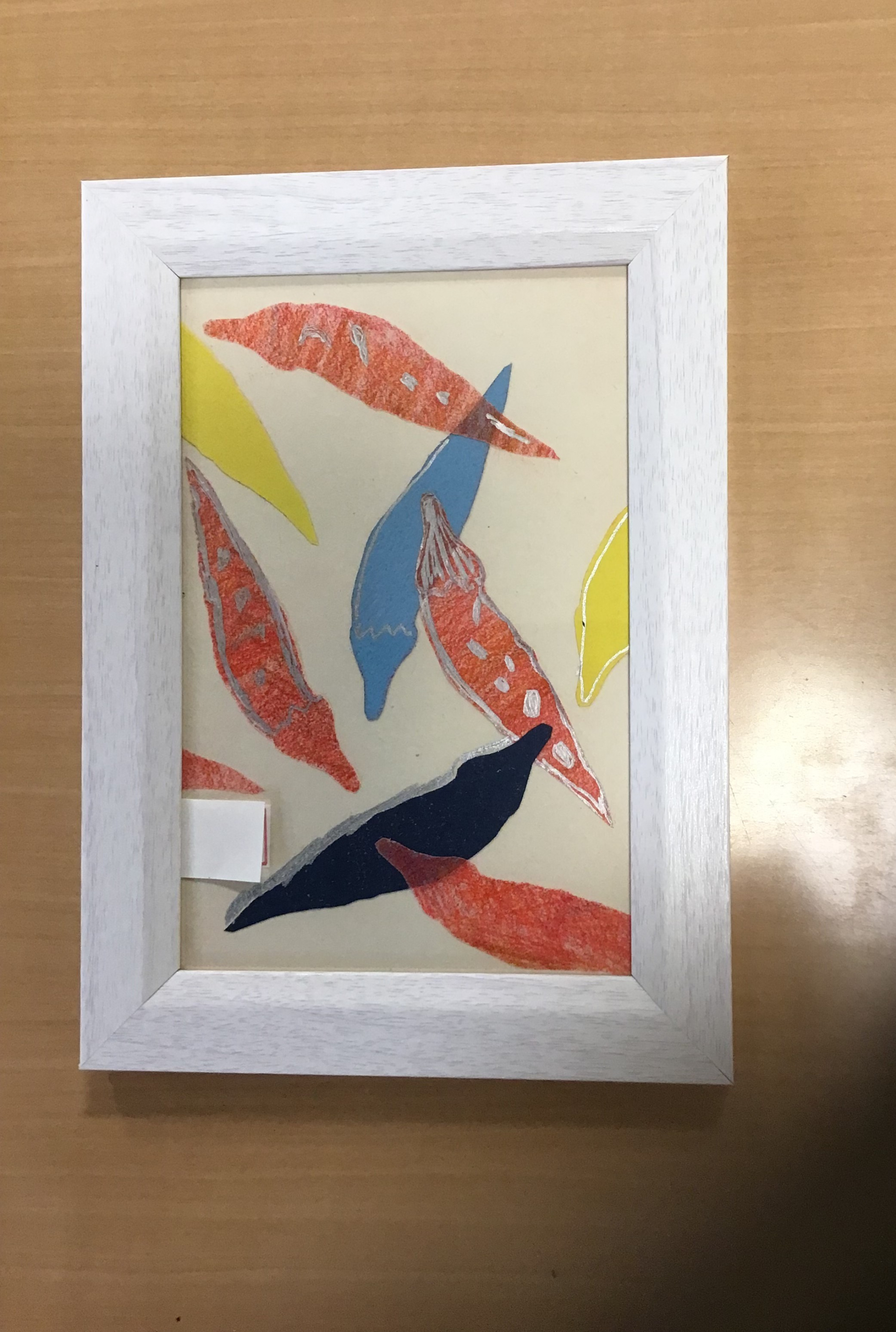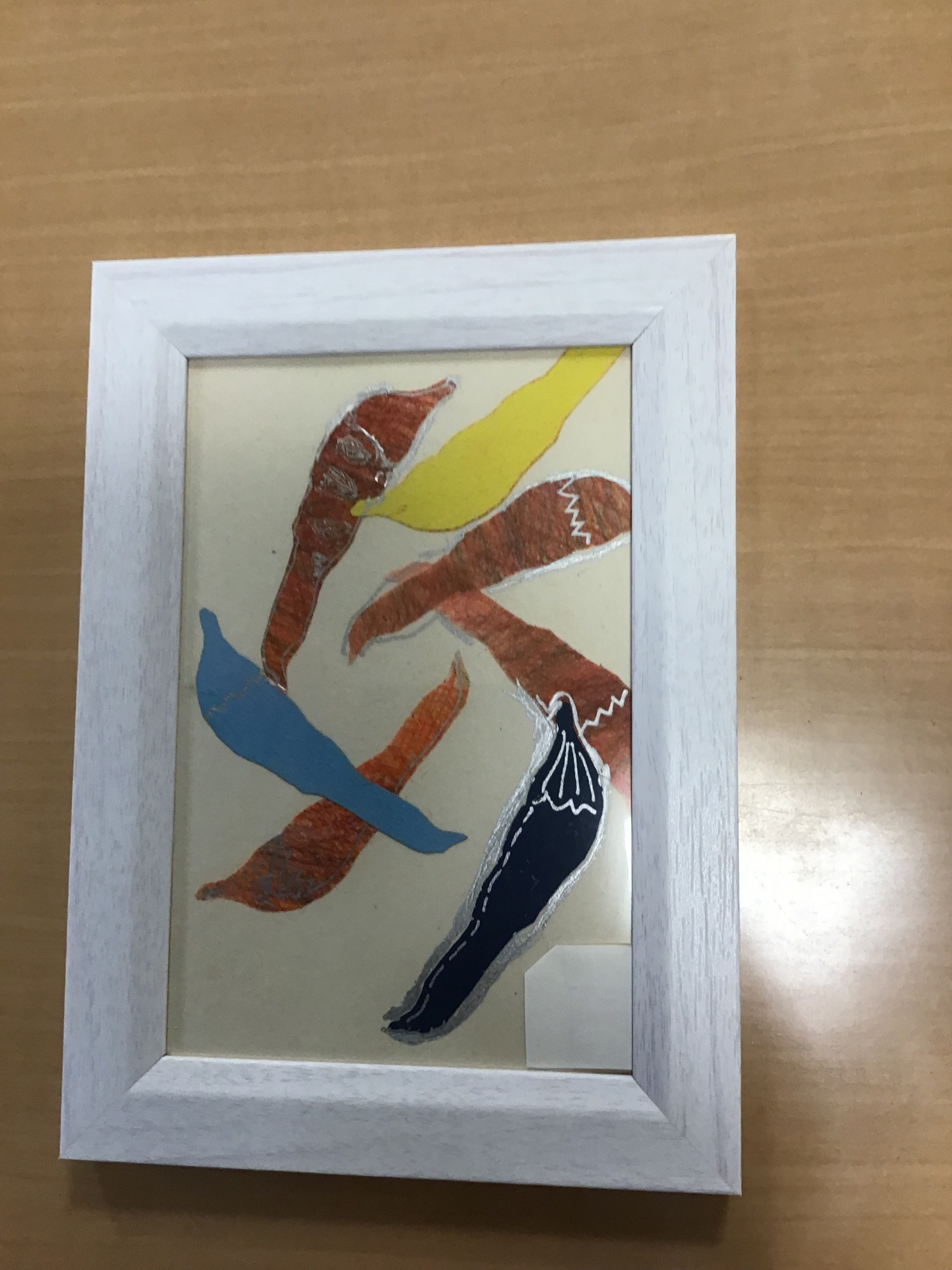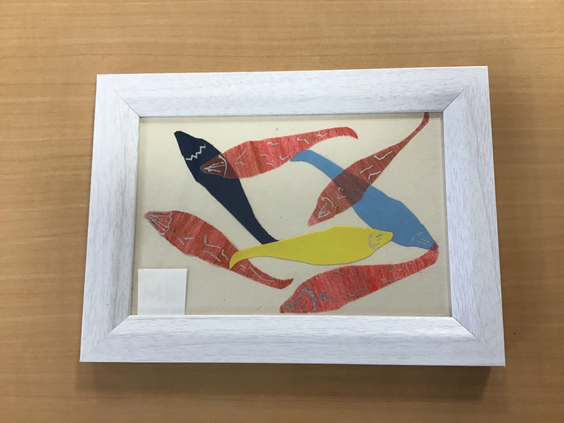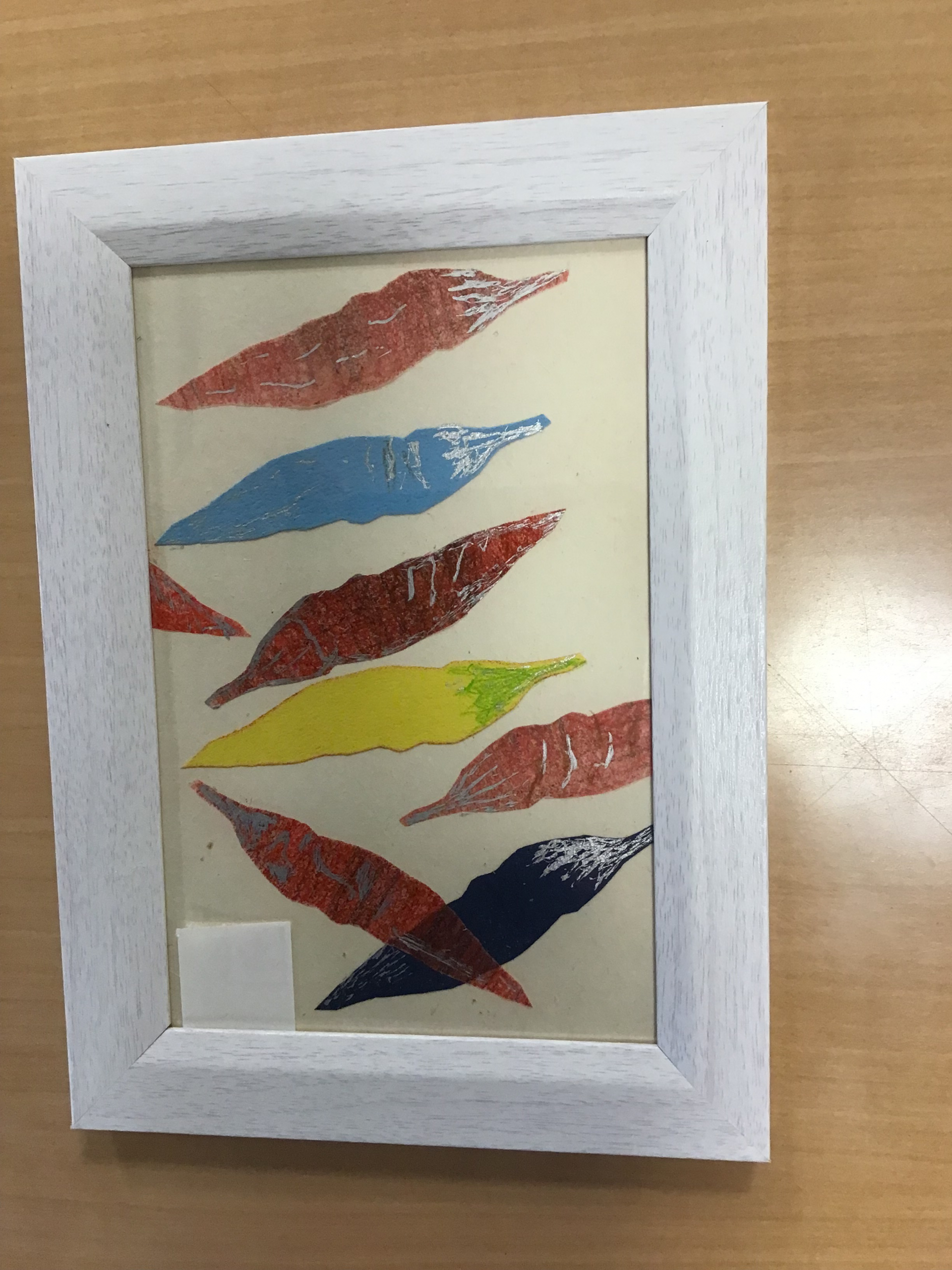 色鉛筆で塗り、唐辛子の形に切り、台紙に並べて、貼り付けて完成です。