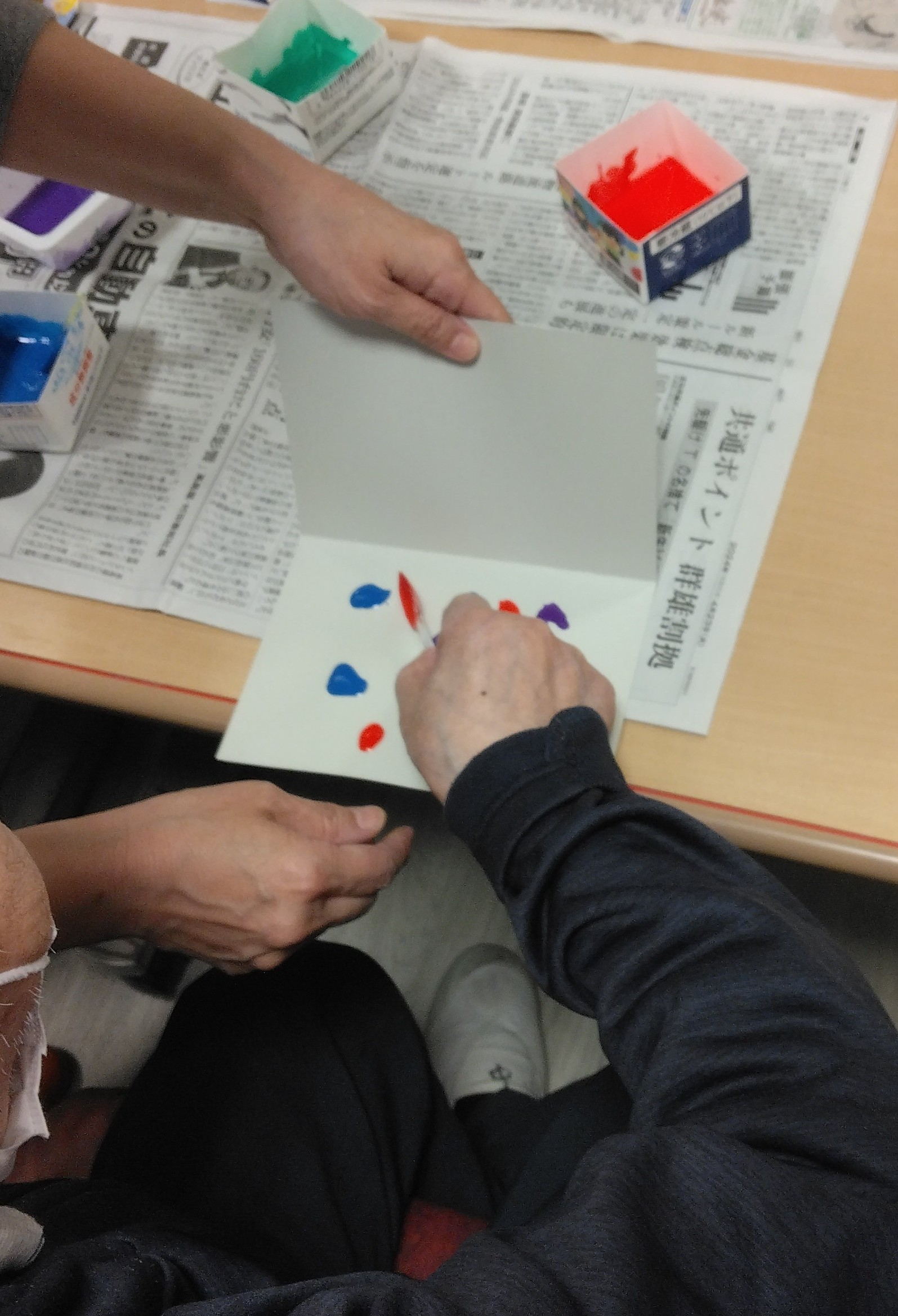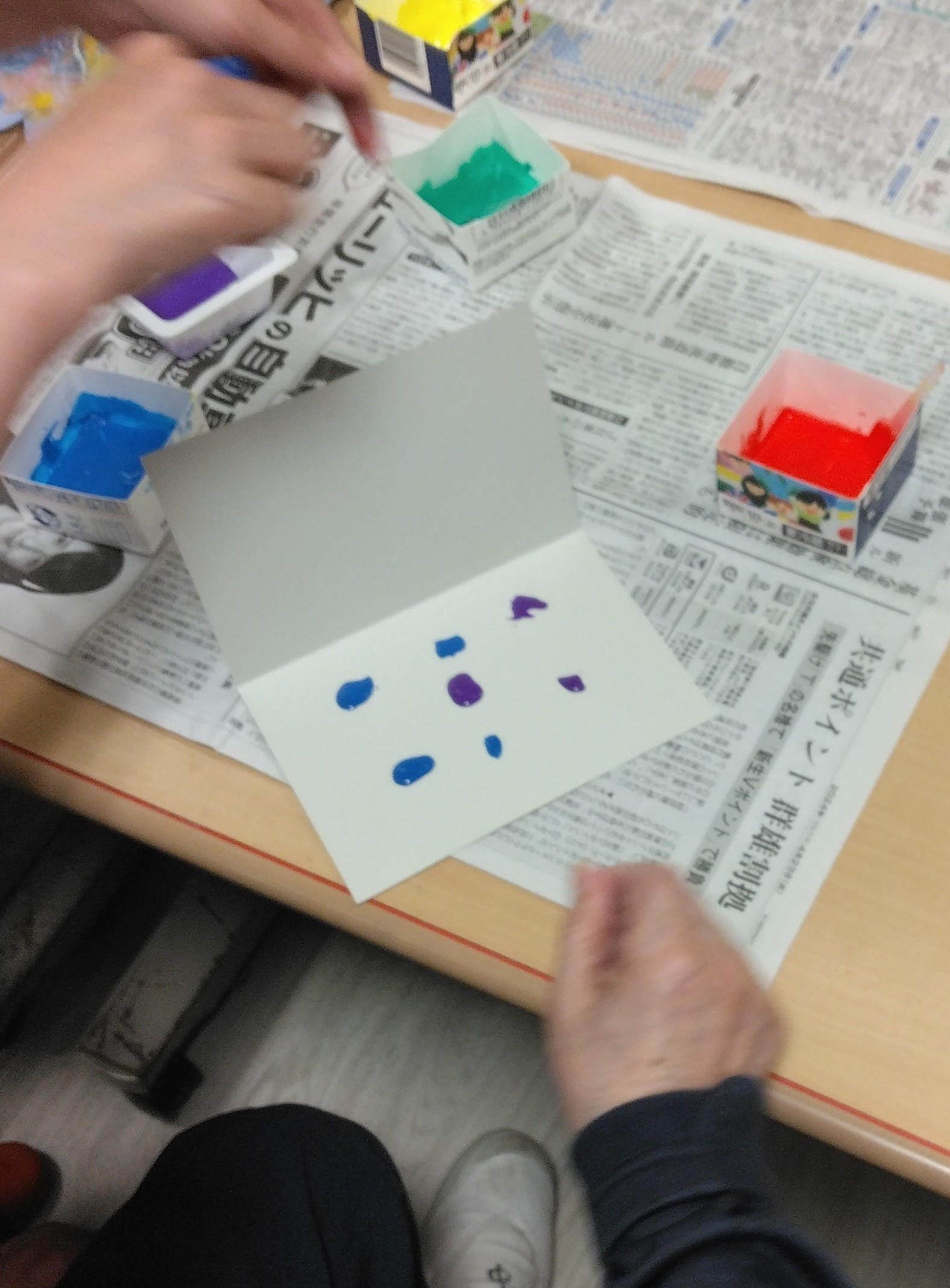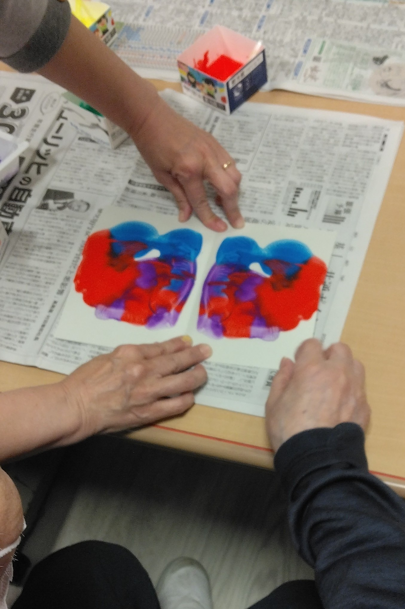 絵の具を乗せた紙を二つ折りにしたあと再度開き、偶発的に絵の具の混ざりあった模様を生み出す技法なのです!