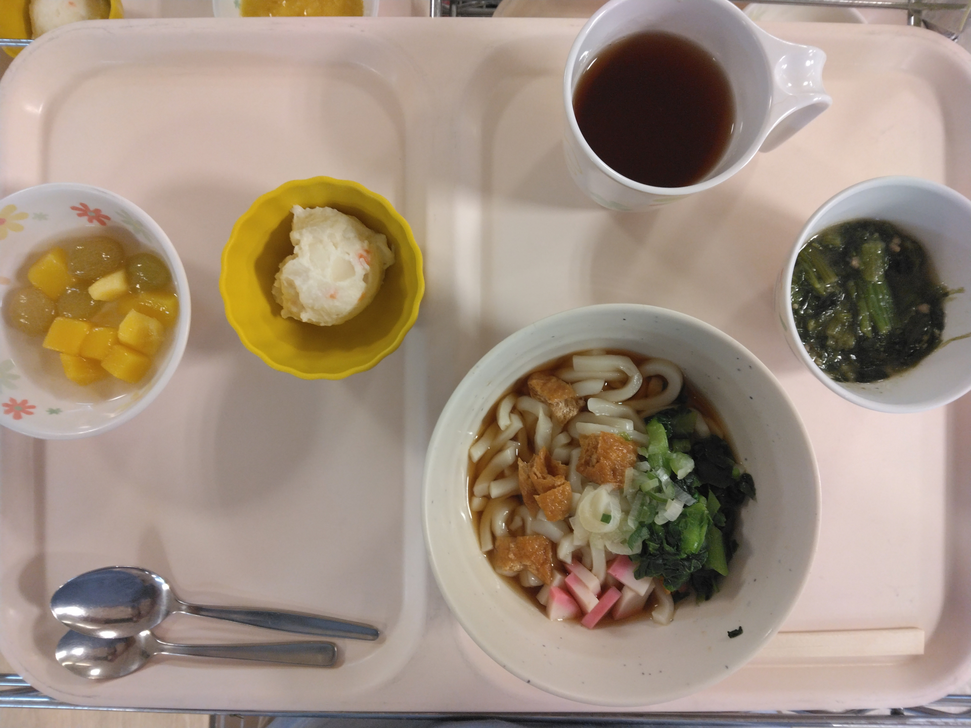冷しきつねうどんに、ホウレン草の炒め物、ポテトサラダ、フルーツ・マンゴー缶といったメニューでした。