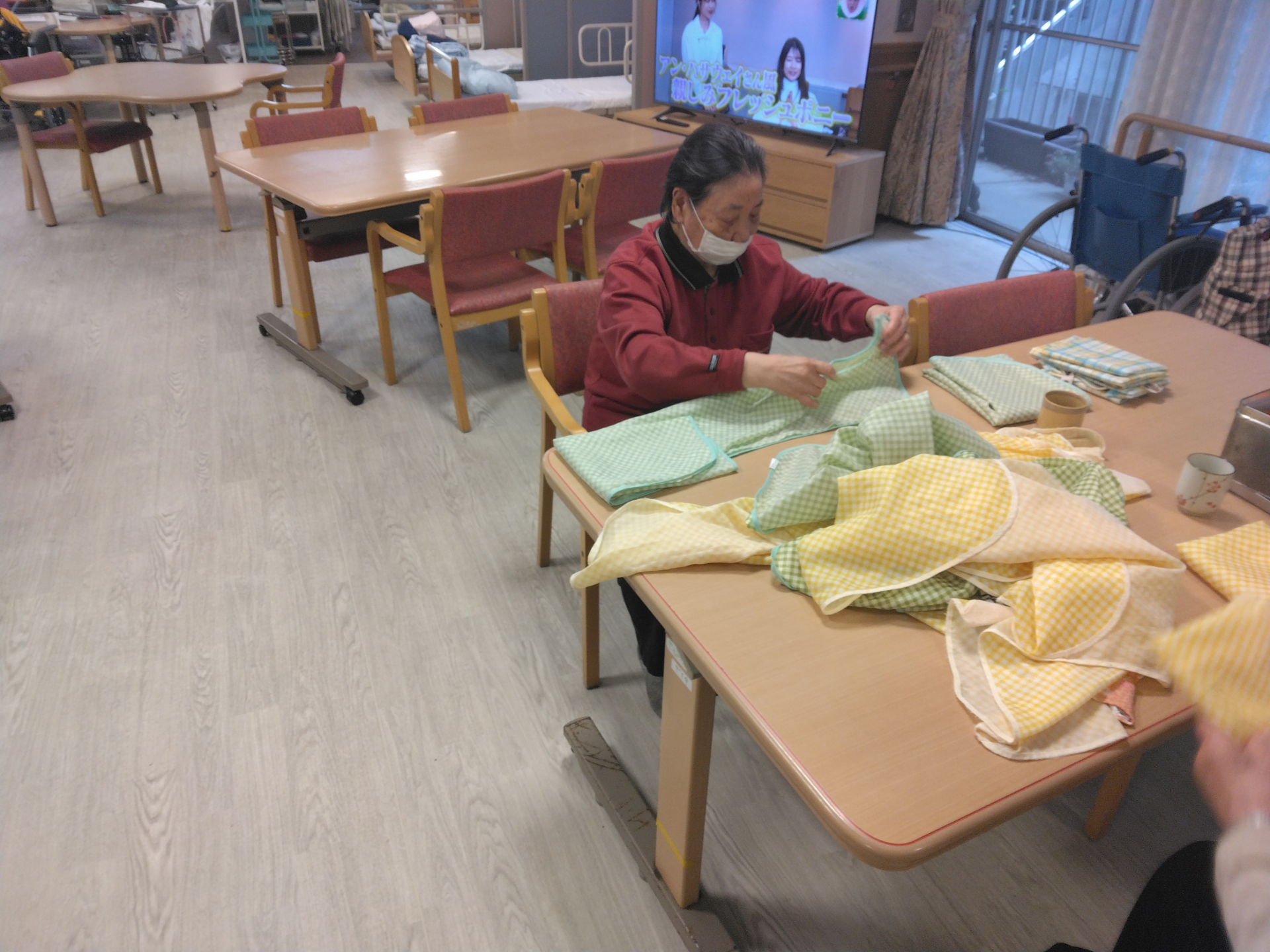 本日も朝の早い時間に、Kさまたちに役割支援を兼ねたエプロンたたみをお願いしました(*^▽^*)