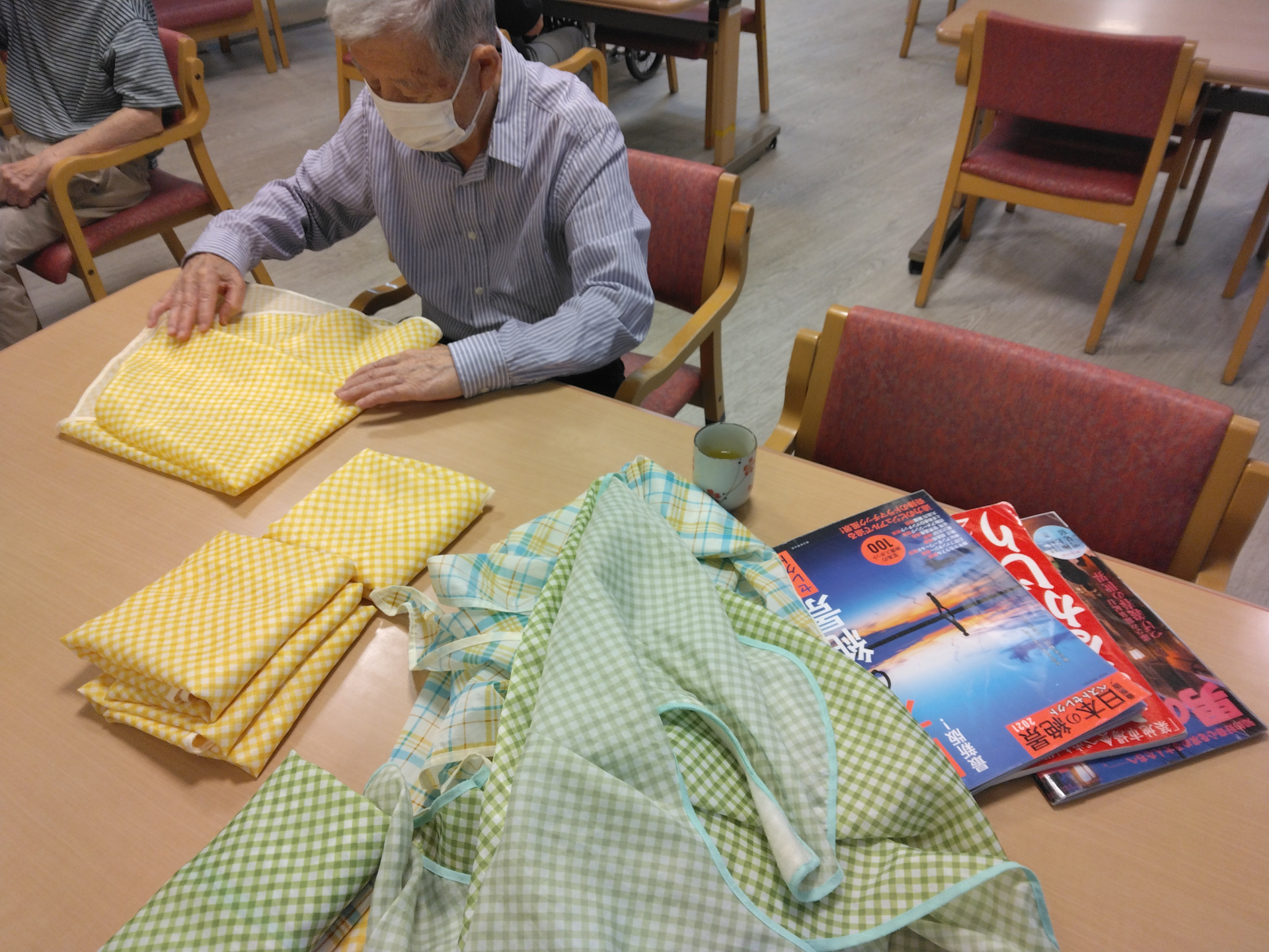 本日は男性のご利用者さまであるHさまに、役割支援を兼ねてエプロンたたみをお願いしました!