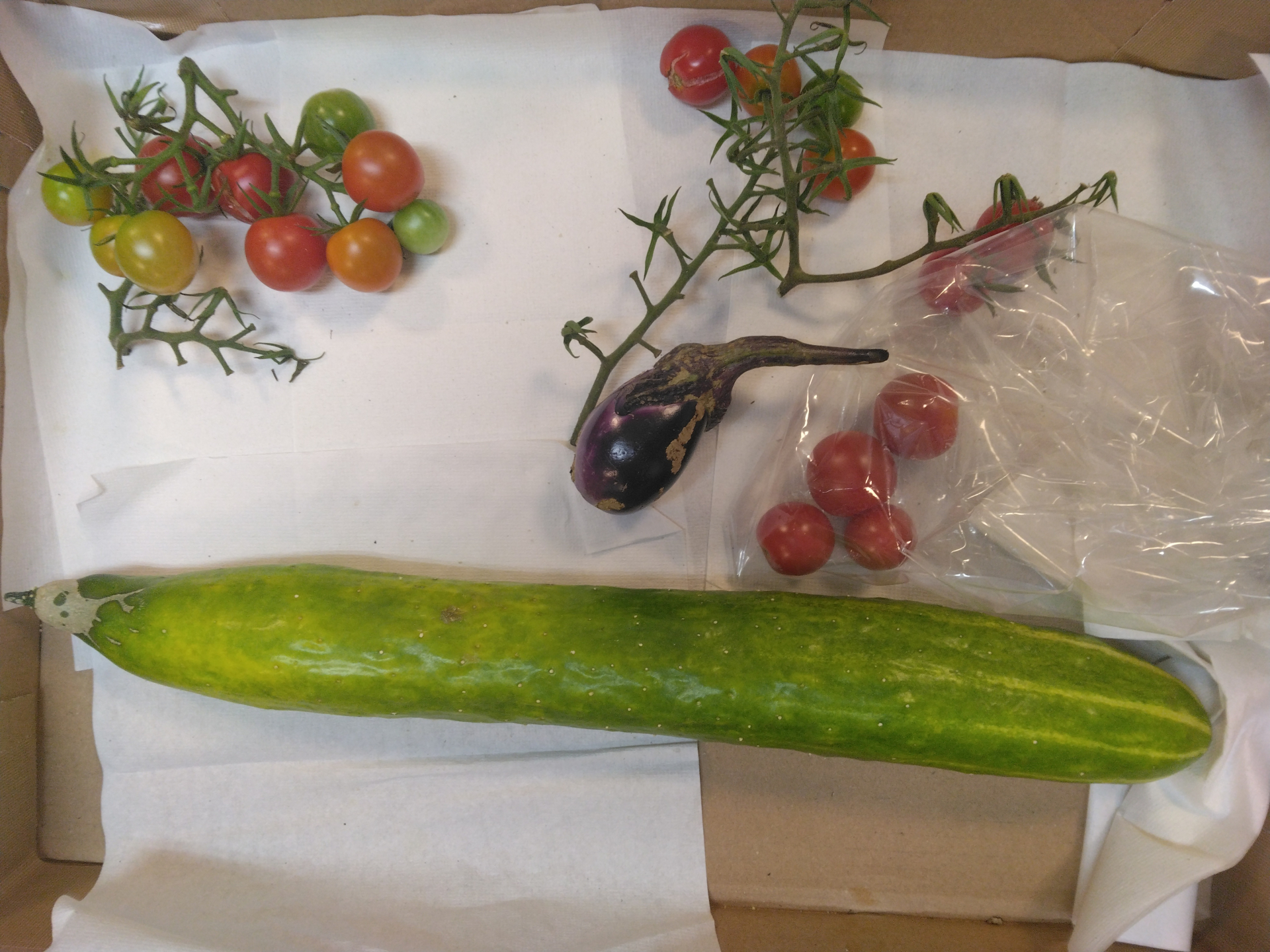 本日は施設の裏庭の家庭菜園で、キュウリとミニトマト、ナスを収穫しましたよ。