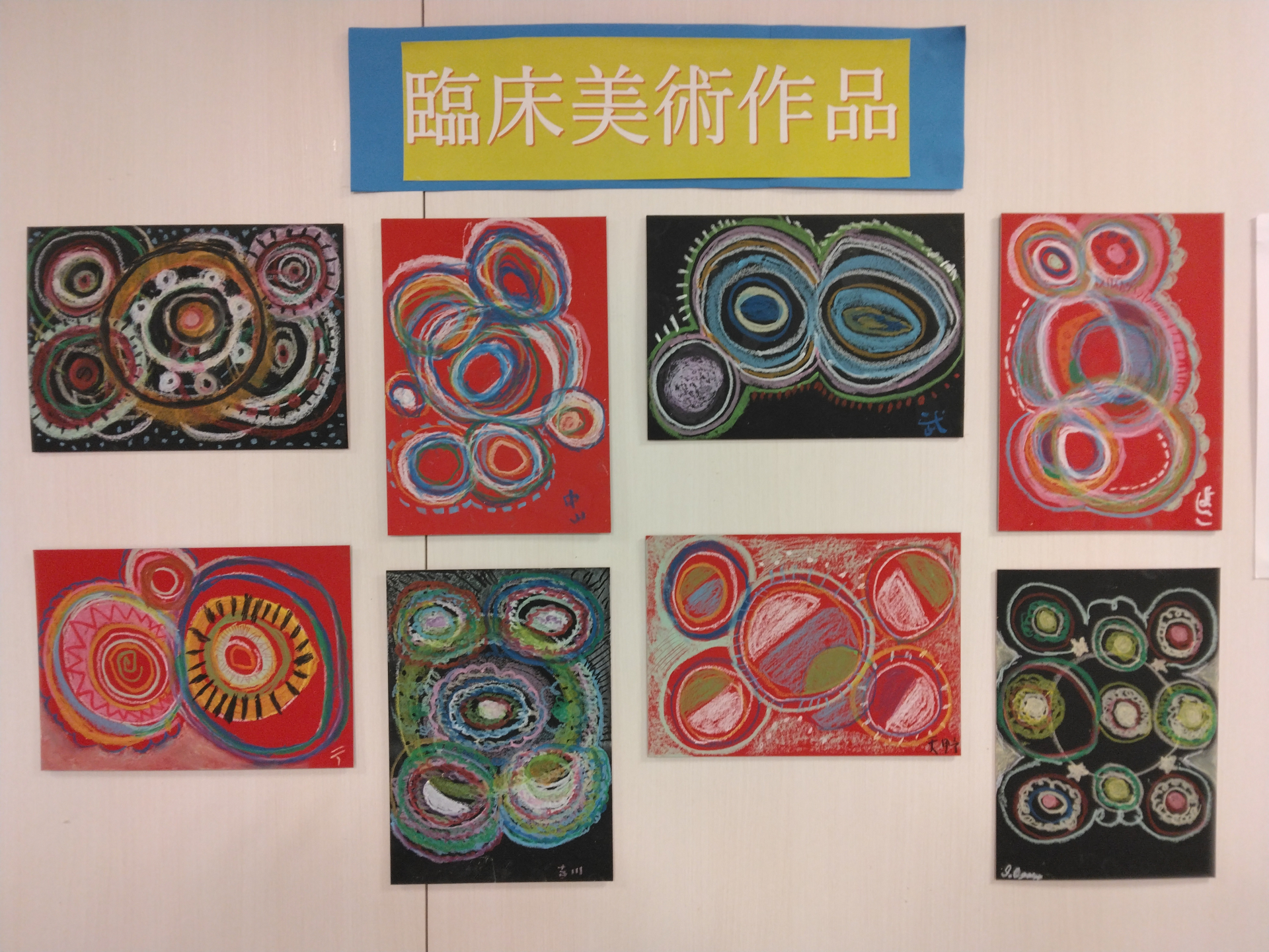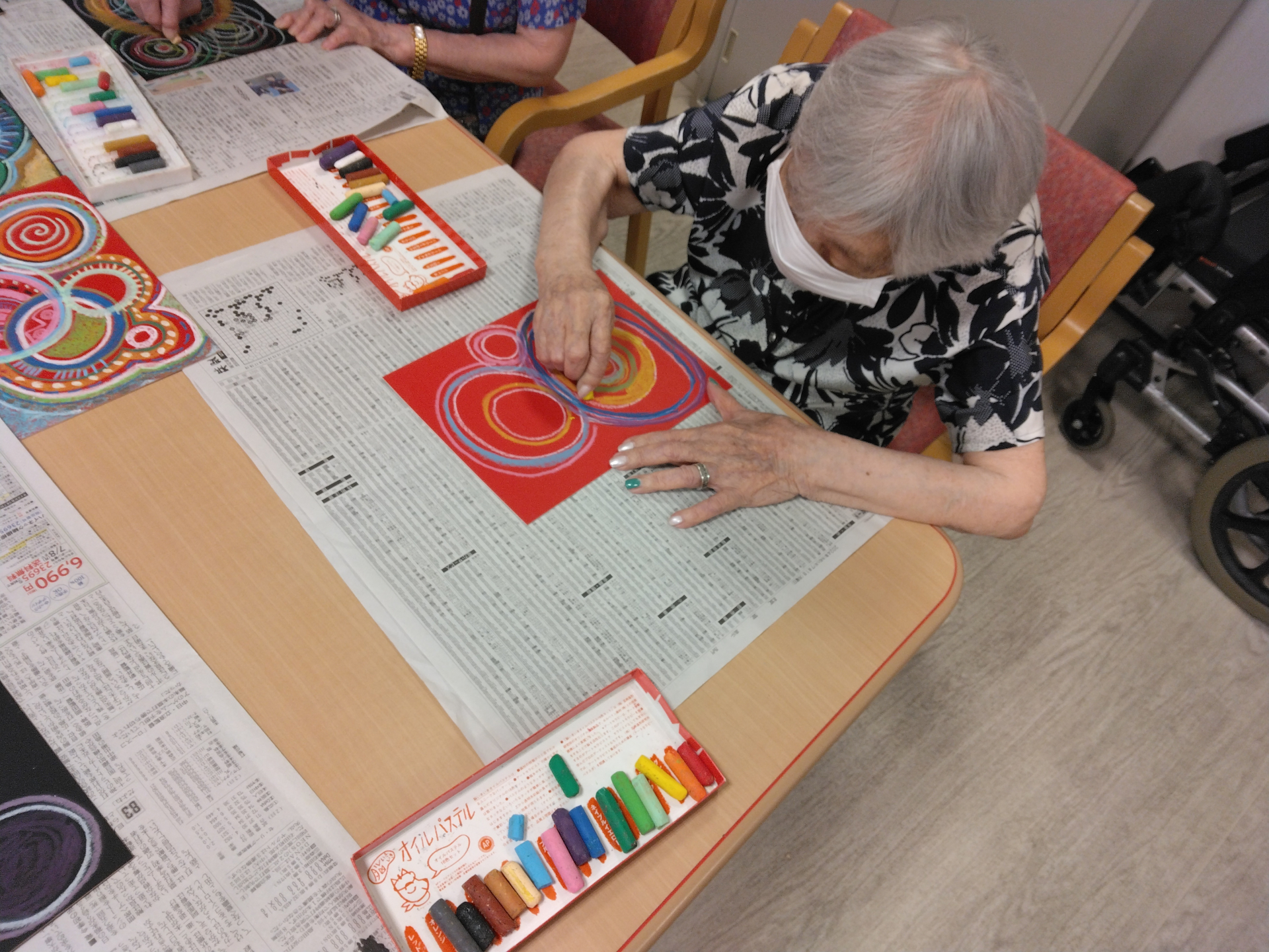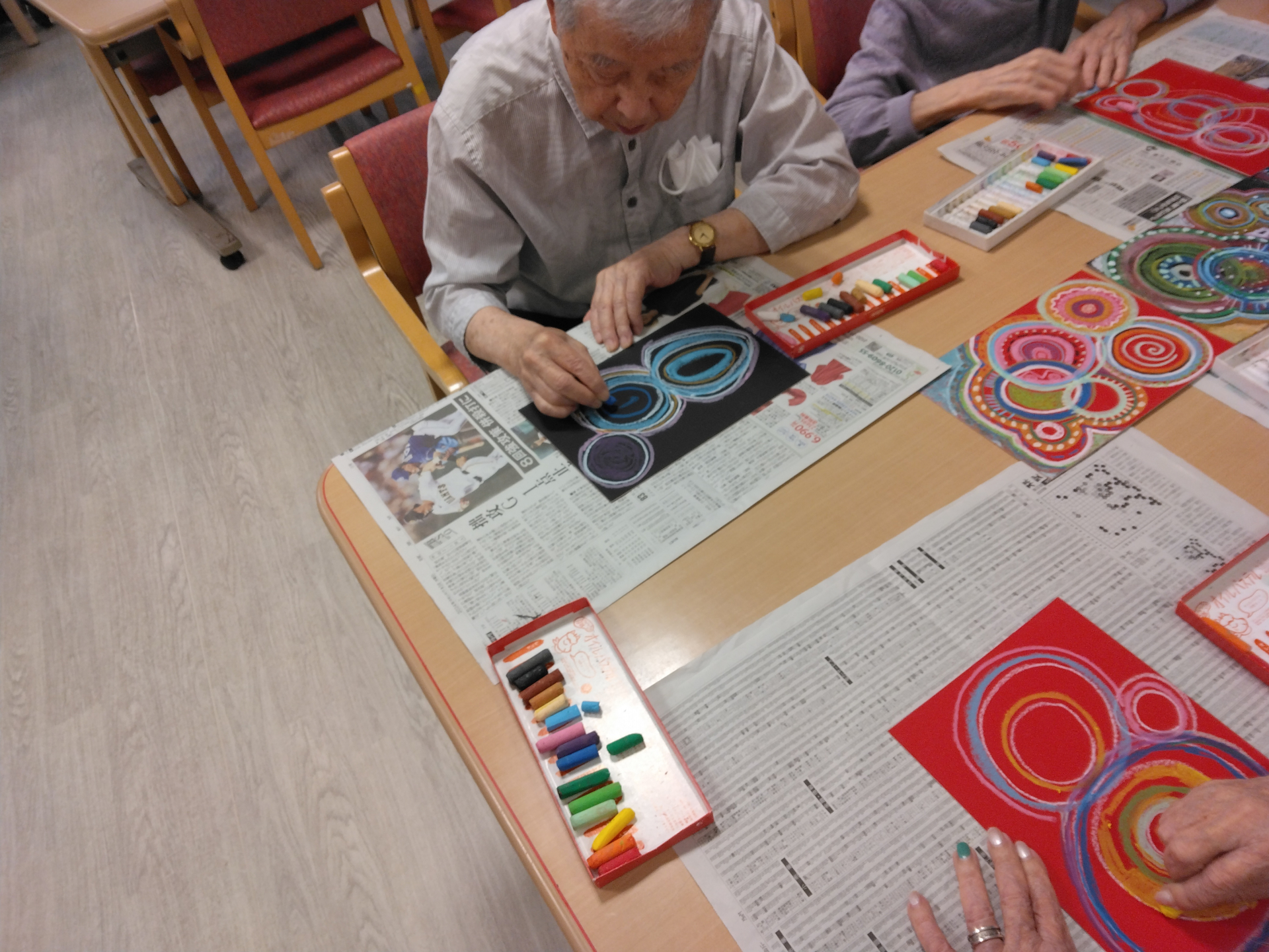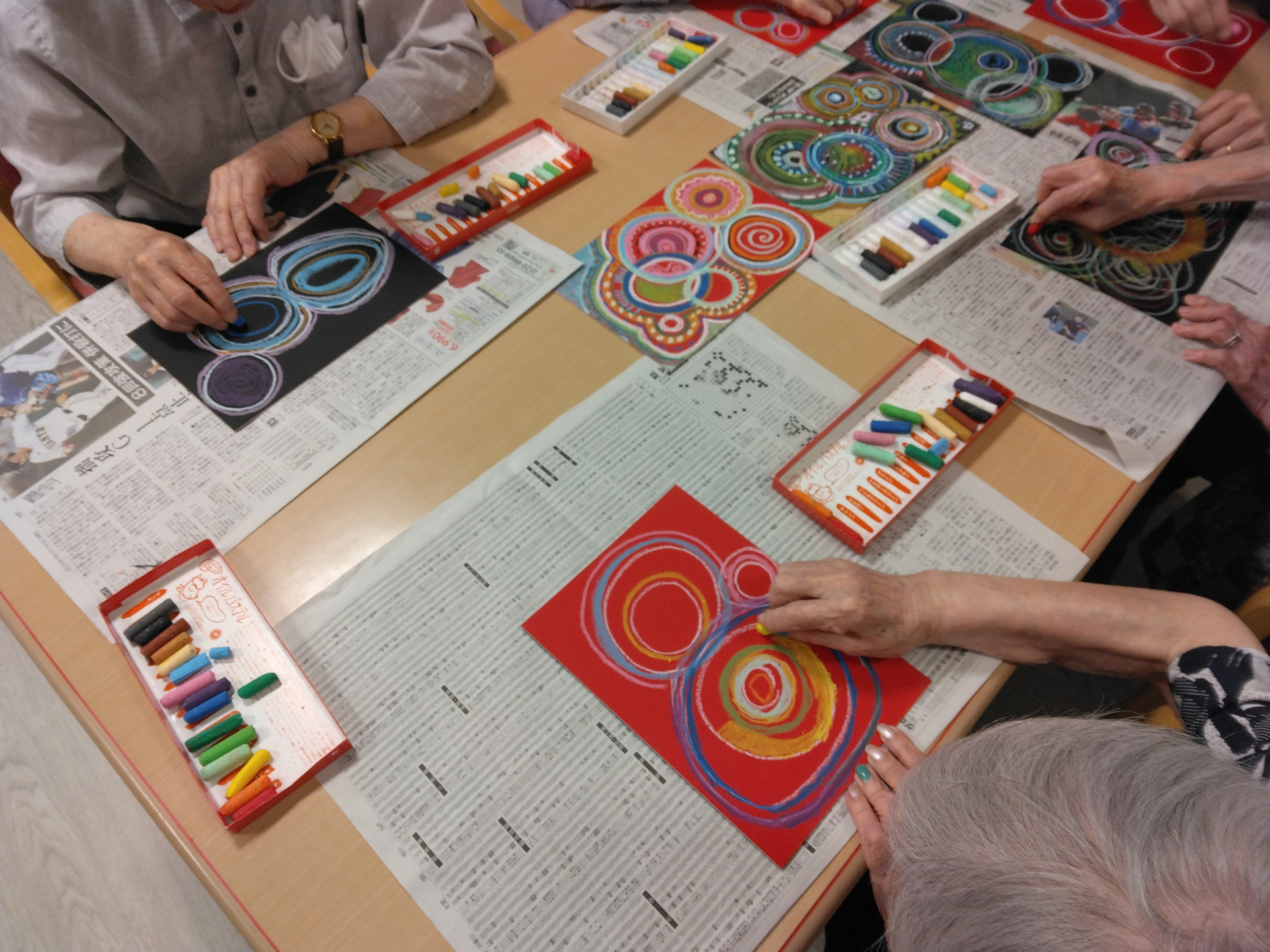 今月の臨床美術教室では皆さまに『広がる丸いかたち』をテーマに、オイルパステルなどを使った色彩表現に挑戦していただきました。
