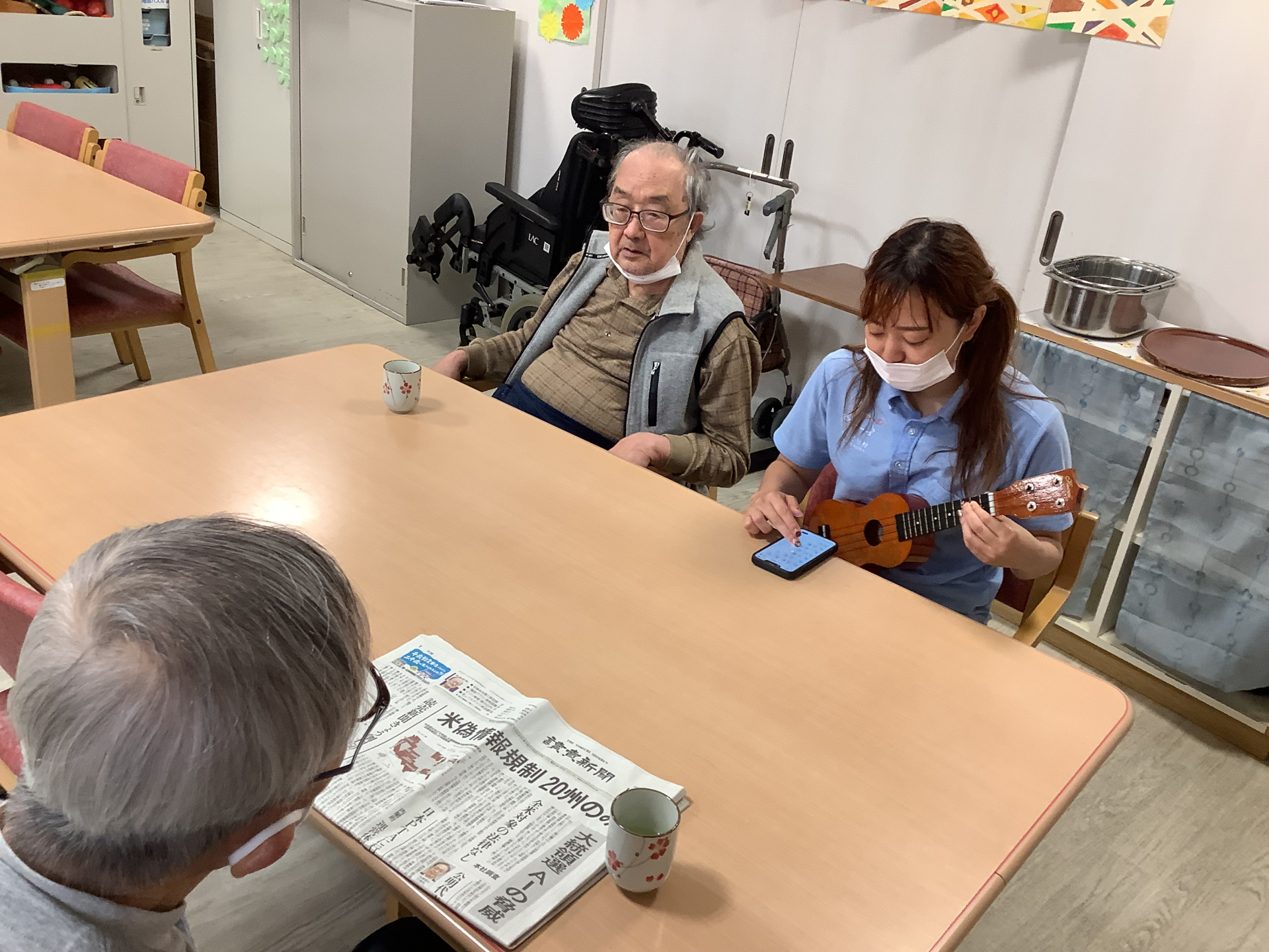 ですが、雨に負けないように朝から職員が持参したウクレレでK様・I様と一緒に涙そうそうを演奏しました!