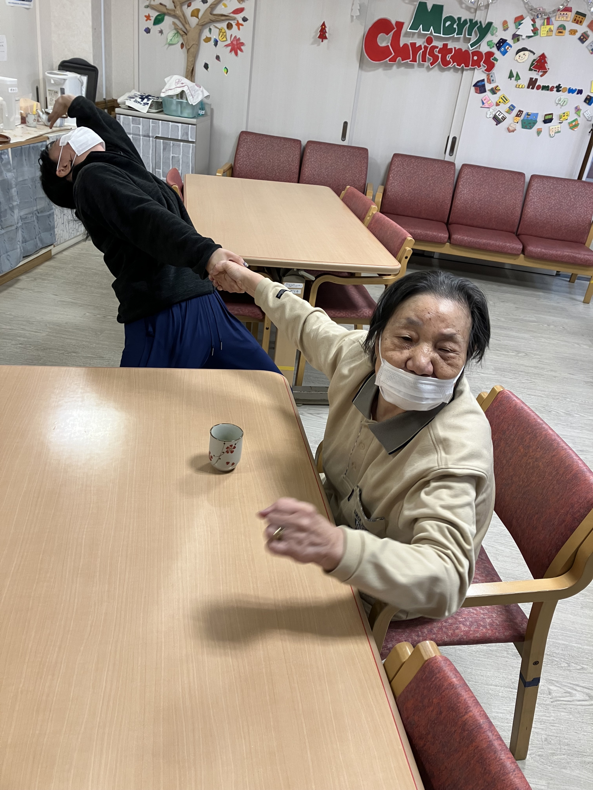 ご来所後早速二人で体操をしていたところ、イナバウアーをしたいとK職員の一言で、やってみることに!
