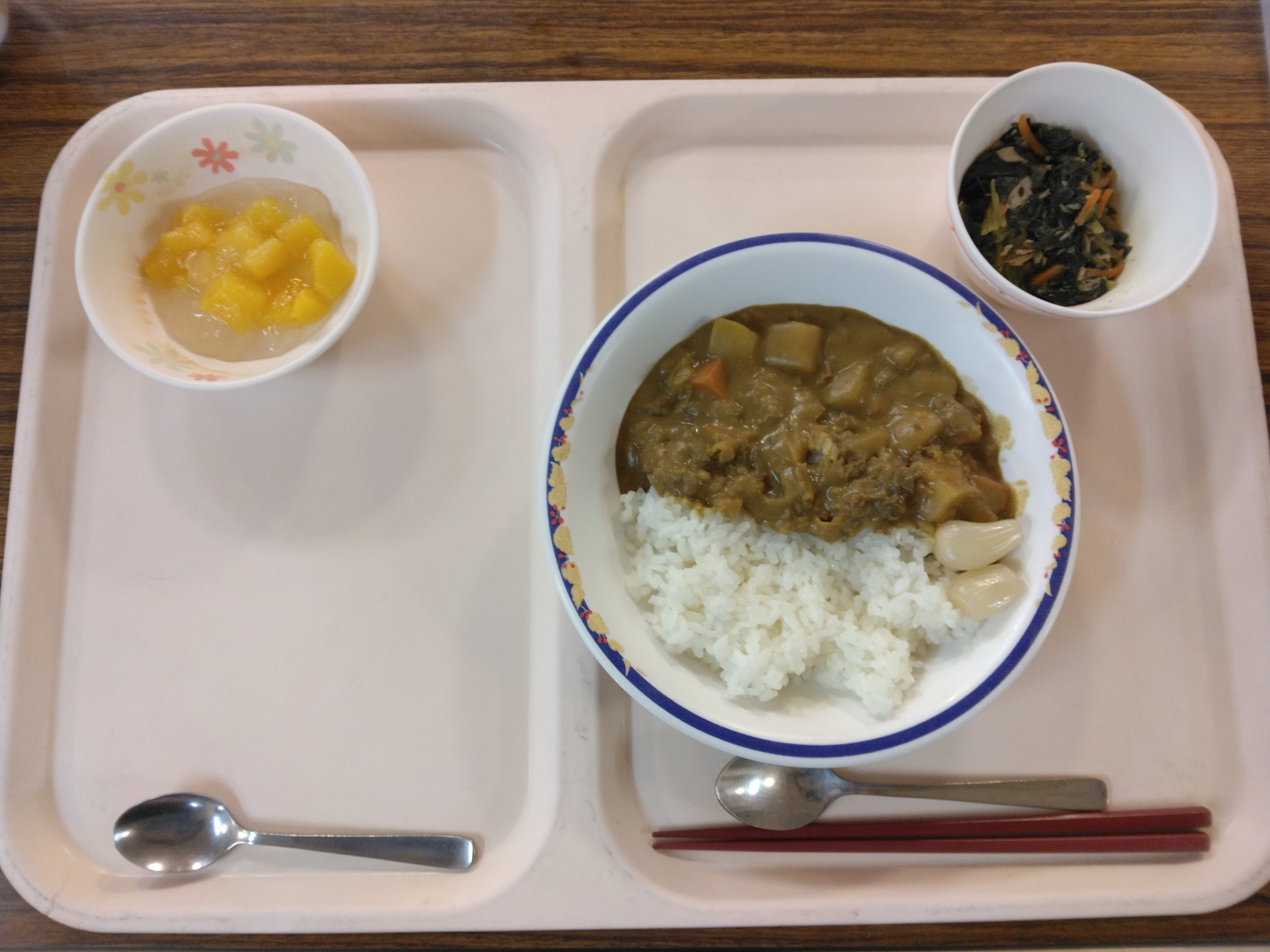 ビーフカレーにほうれん草とツナのソテー、黄桃缶のピーチジュレといった献立でした!