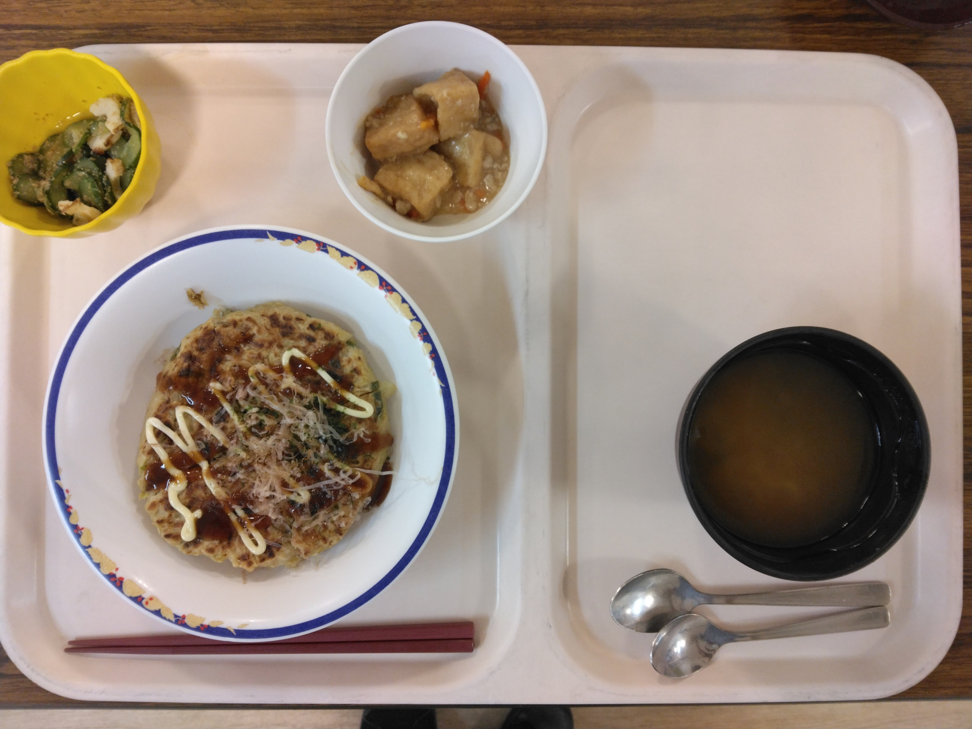 豚肉のお好み焼きの他に、絹揚げのそぼろ煮、胡瓜とちくわのごま酢和え、玉ねぎとうまい菜のお味噌汁といったメニューでした!