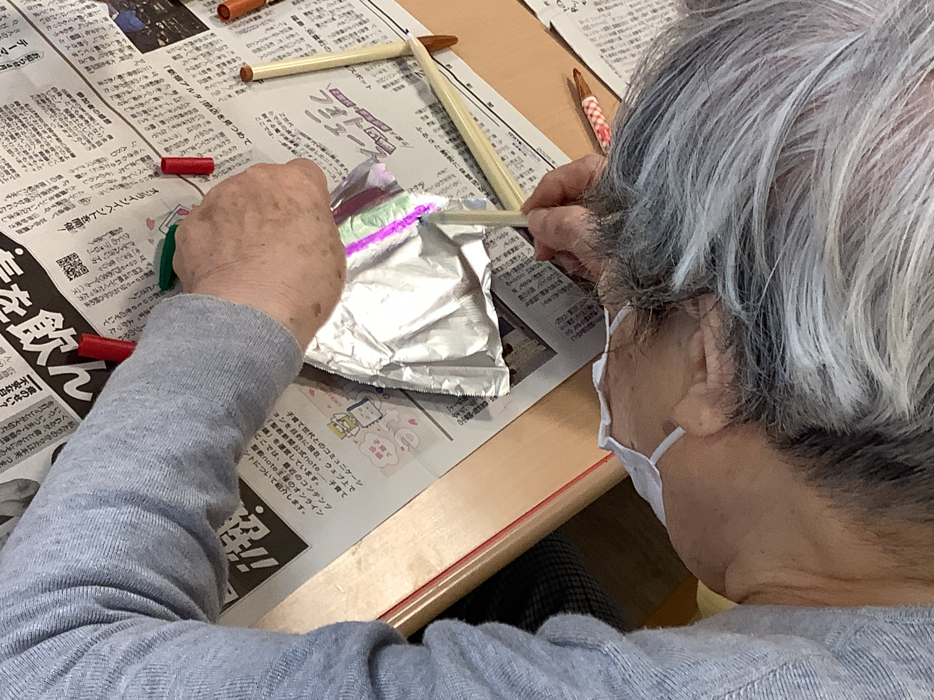 本日の手工芸プログラムは、「季節の壁画制作」と題しまして、壁画作品『ヨーヨー』に挑戦していただきました(^○^)