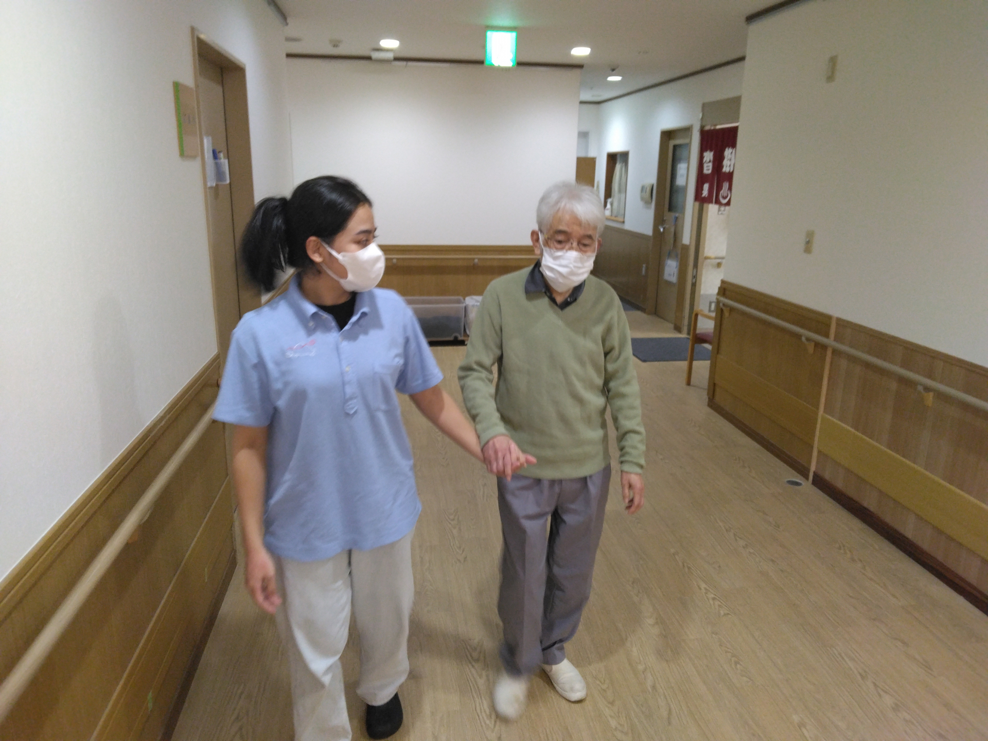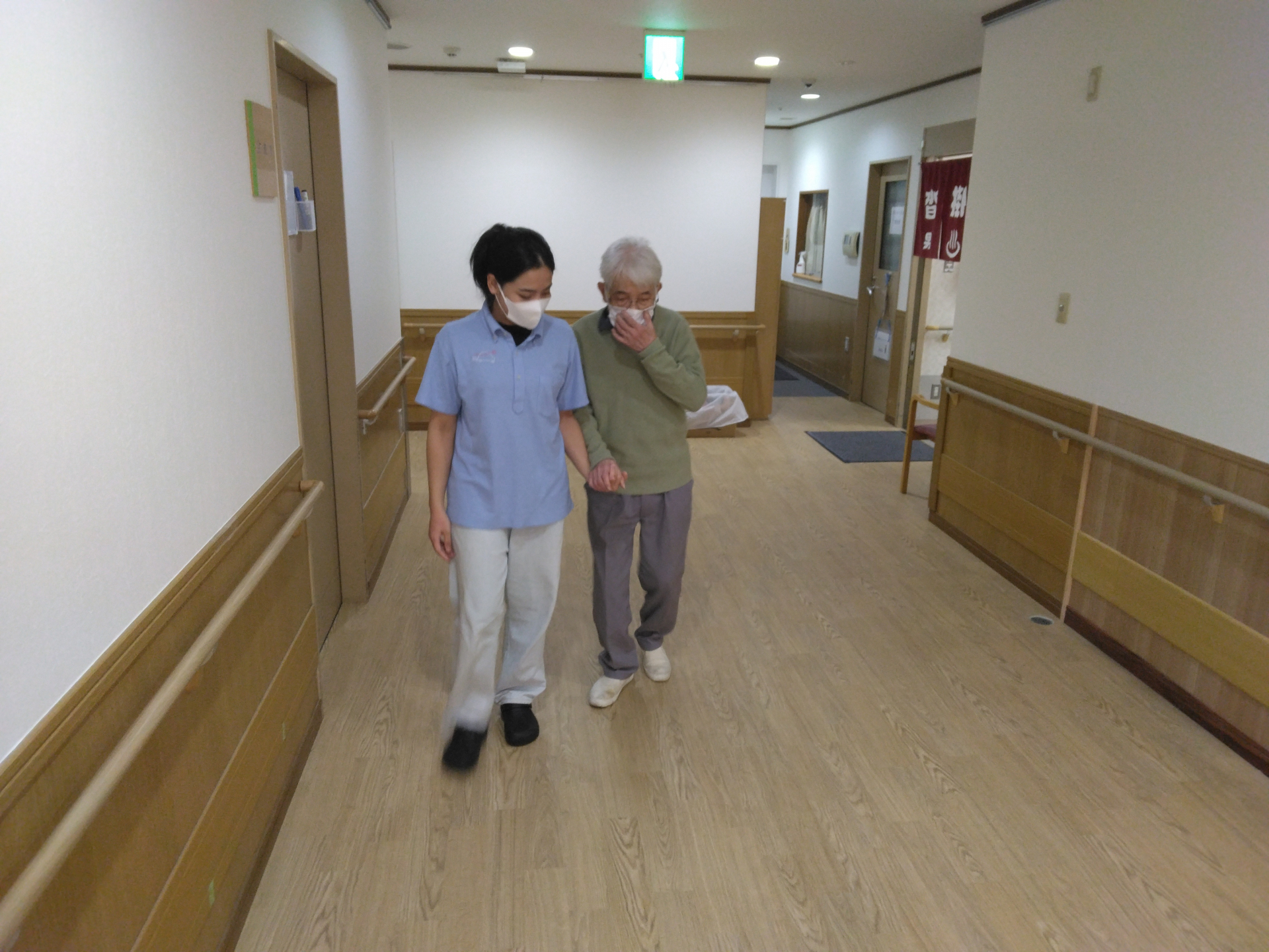 午後のおやつ後の時間、少し気持ちが落ち着かないご様子で廊下の方へ向かっていらっしゃったので、職員がそのまま廊下歩行訓練にお誘いいたしました~。